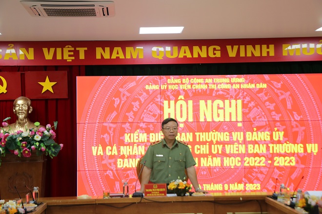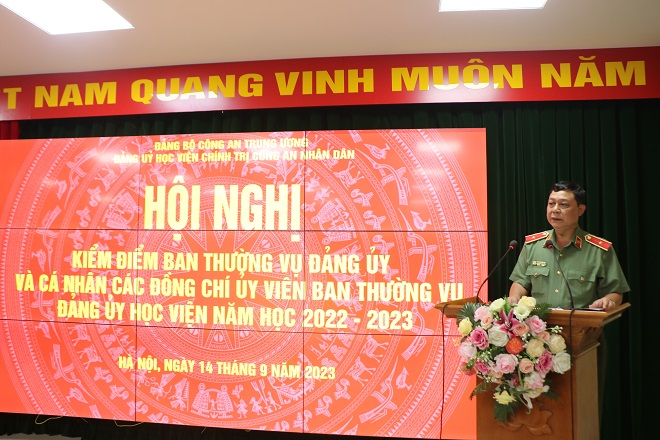 Thực hiện Quy định số 04-QĐ/ĐUCA, ngày 12-10-2022 của Đảng ủy Công an Trung ương về việc kiểm điểm và đánh giá, xếp loại chất lượng đối với tập thể, cá nhân trong Công an nhân dân; Công văn số 1778-CV/ĐUCA, ngày 09-6-2023 của Đảng ủy Công an Trung ương về việc gợi ý kiểm điểm tập thể, cá nhân năm học 2022-2023, ngày 14 tháng 9 năm 2023, Đảng ủy Học viện Chính trị Công an nhân dân đã trang trọng tổ chức Hội nghị kiểm điểm tập thể Ban Thường vụ Đảng ủy, cá nhân các đồng chí trong Ban Thường vụ, Ban Giám đốc Học viện năm học 2022 - 2023.