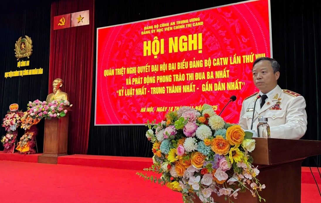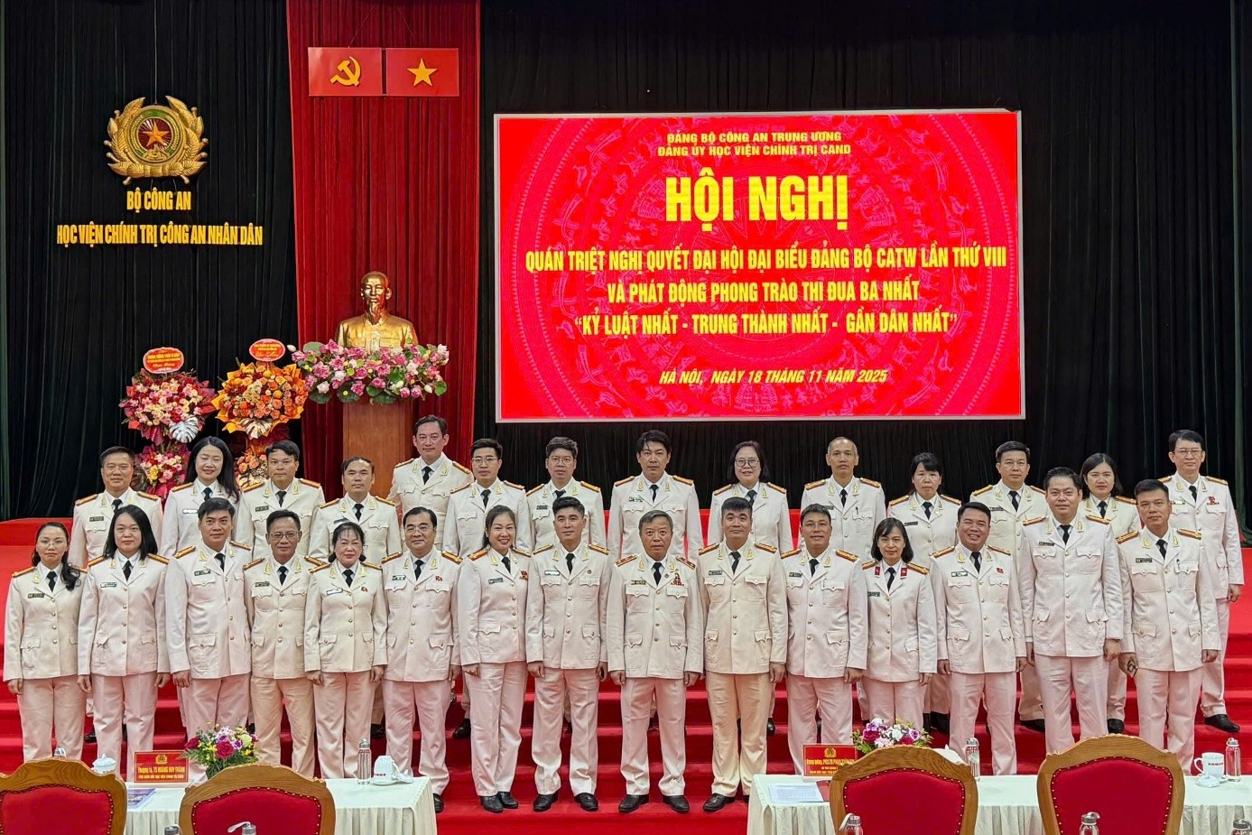 Thực hiện Công văn số 79-CV/ĐUCA, ngày 04/11/2025 của Đảng ủy Công an Trung ương về việc quán triệt Văn kiện Đại hội đại biểu Đảng bộ CATW lần thứ VIII nhiệm kỳ 2025-2030; Công văn số 9095/X03-P3, ngày 27/10/2025 của Cục Công tác chính trị về việc tổ chức Hội nghị quán triệt Nghị quyết Đại hội đại biểu Đảng bộ CATW lần thứ VIII và phát động phong trào thi đua “Ba nhất: Kỷ luật nhất - Trung thành nhất - Gần dân nhất”; ngày 18/11/2025, Đảng ủy Học viện Chính trị CAND đã trang trọng tổ chức Hội nghị quán triệt Nghị quyết Đại hội đại biểu Đảng bộ CATW lần thứ VIII nhiệm kỳ 2025-2030 và phát động phong trào thi đua “Ba nhất: Kỷ luật nhất - Trung thành nhất - Gần dân nhất” trong Đảng bộ Học viện.