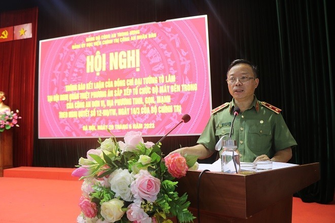 Ngày 28/6/2023, tại Học viện Chính trị CAND, đồng chí Trung tướng, PGS. TS Phan Xuân Tuy, Bí thư Đảng ủy, Giám đốc Học viện đã quán triệt kết luận của đồng chí Đại tướng Tô Lâm, Bộ trưởng Bộ Công an tại Hội nghị quán triệt phương án sắp xếp tổ chức bộ máy bên trong của Công an đơn vị, địa phương tinh, gọn, mạnh theo Nghị quyết số 12-NQ/TW, ngày 16/3/2022 của Bộ Chính trị. Thành phần dự Hội nghị có các đồng chí trong Ban Thường vụ Đảng ủy, Ban Giám đốc Học viện, lãnh đạo các đơn vị và toàn thể cán bộ, giảng viên Học viện.