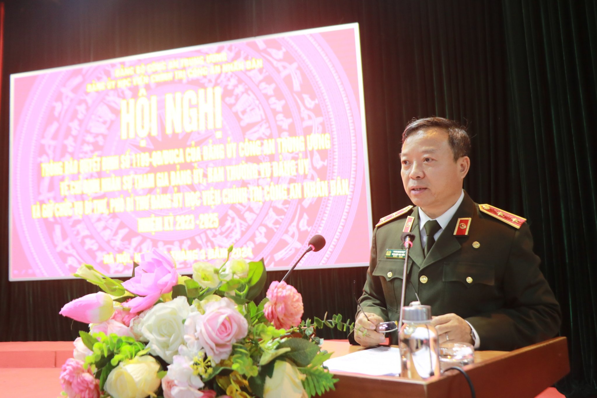Thực hiện Quyết định 952-QĐ/ĐUCA ngày 24/4/2023 của Đảng uỷ CATW về kiện toàn tổ chức đảng và thực tiễn công tác cán bộ chủ chốt của Học viện, Đảng uỷ Học viện đã báo cáo, đề xuất kiện toàn Ban chấp hành Đảng bộ nhiệm kỳ 2023 – 2025. Ngày 08/3/2024 đồng chí Bí thư Đảng uỷ CATW đã ký Quyết định số 1189-QĐ/ĐUCA, X01 có văn bản số 3051/X01-P8 triển khai thực hiện; Đảng uỷ Học viện đã ban hành kế hoạch số 164-KH/ĐUT03, ngày 15-3-2024 để kịp thời quán triệt thực hiện, sáng 19/3/2024, Đảng ủy Học viện Chính trị CAND tổ chức Hội nghị thông báo Quyết định số 1189-QĐ/ĐUCA về chỉ định nhân sự tham gia Đảng ủy, Ban Thường vụ Đảng ủy và giữ chức vụ Bí thư, Phó Bí thư Đảng ủy Học viện Chính trị CAND nhiệm kỳ 2023 -2025.