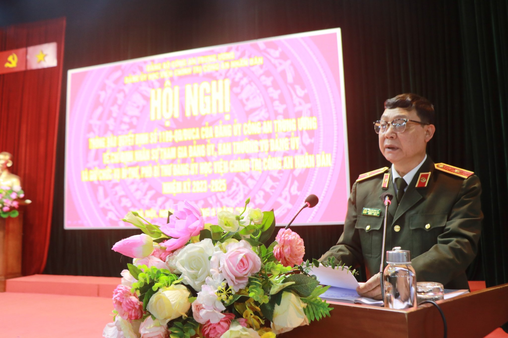 Phát biểu tại Hội nghị, đồng chí Bí thư Đảng ủy, Giám đốc Học viện đã nhấn mạnh việc triển khai thực hiện Quyết định số 1189-QĐ/ĐUCA về chỉ định nhân sự tham gia Đảng ủy, Ban Thường vụ Đảng ủy và giữ chức vụ Bí thư, Phó Bí thư Đảng ủy Học viện Chính trị CAND nhiệm kỳ 2023-2025 và Công văn số 3051/X01-P8, ngày 08/3/2024 của Cục Tổ chức cán bộ về việc kiện toàn tổ chức đảng trực thuộc và chỉ định Đảng ủy, Ban Thường vụ, bí thư, phó bí thư Đảng ủy T03 là nhiệm vụ quan trọng của Đảng ủy Học viện. Đề nghị các đơn vị, cơ quan tham mưu khẩn trương triển khai các nhiệm vụ theo Quy định, hướng dẫn của Đảng ủy CATW; ổn định tổ chức, hoạt động hiệu quả, không để gián đoạn sự lãnh đạo, chỉ đạo của Đảng uỷ, Ban Thường vụ Đảng uỷ Học viện đối với mọi mặt công tác. Đồng chí Bí thư Đảng ủy Học viện cũng đề nghị toàn thể cán bộ, đảng viên Học viện phải nâng cao tinh thần trách nhiệm, gương mẫu, chủ động trong học tập, nghiên cứu, phấn đấu hoàn thành tốt, đạt và vượt chỉ tiêu các nhiệm vụ, chỉ tiêu trong thời gian tới.