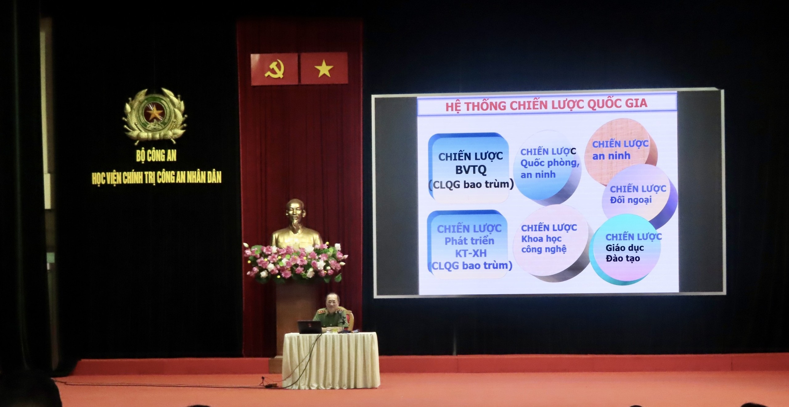 Đồng chí Trung tướng, PGS.TS Phan Xuân Tuy cùng các đồng chí trong Ban Giám đốc Học viện tặng hoa cảm ơn đồng chí Thượng tướng,PGS.TS Nguyễn Văn Thành