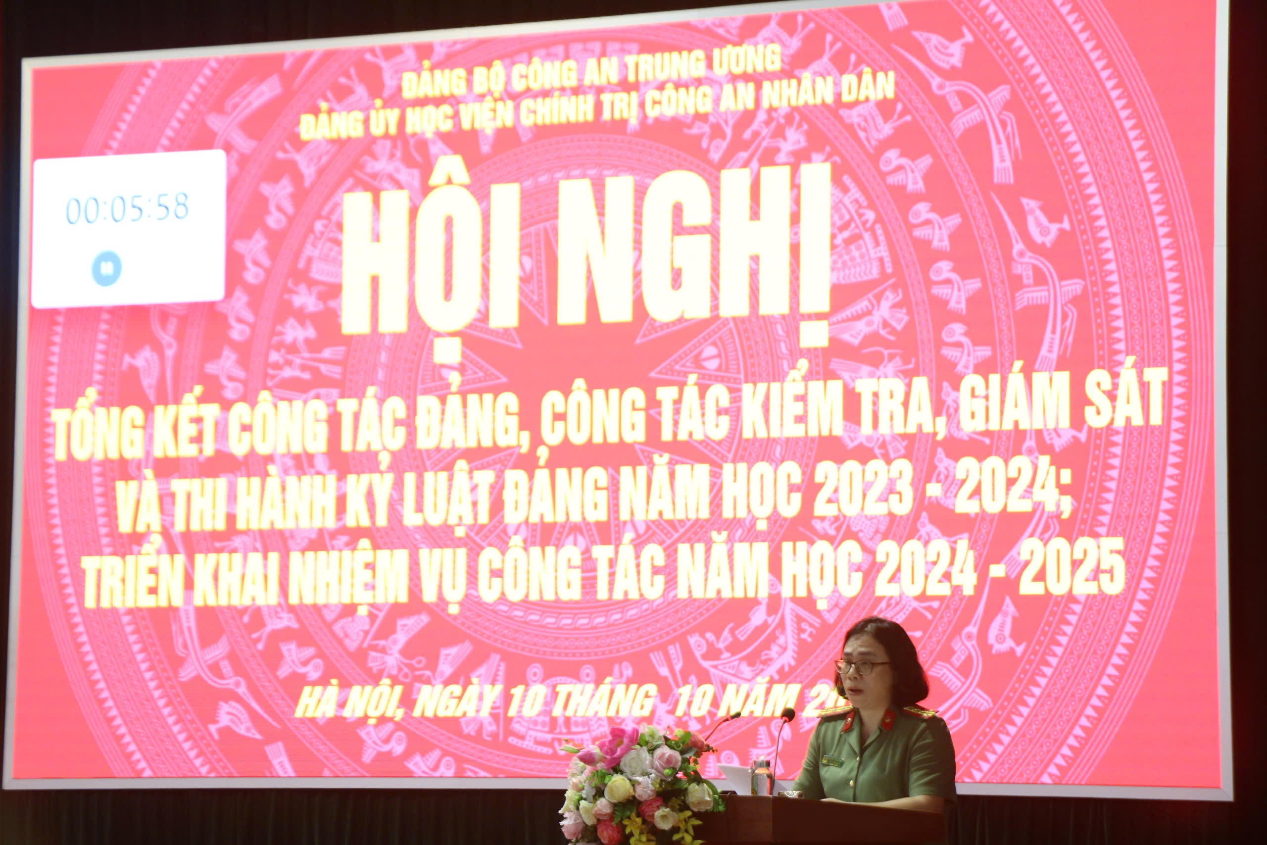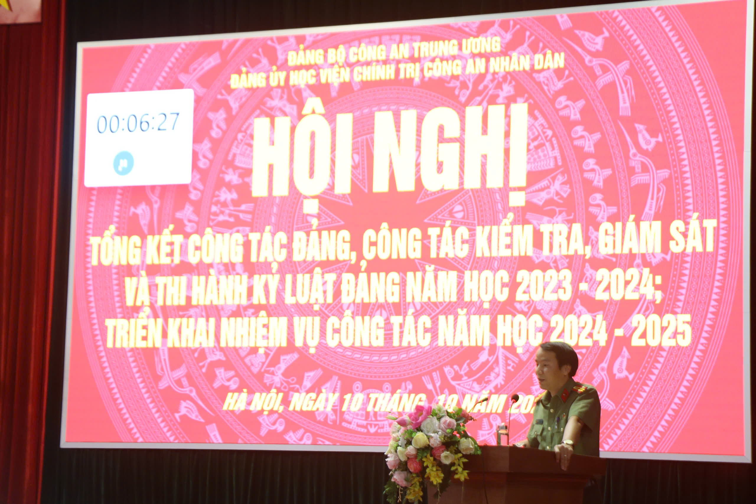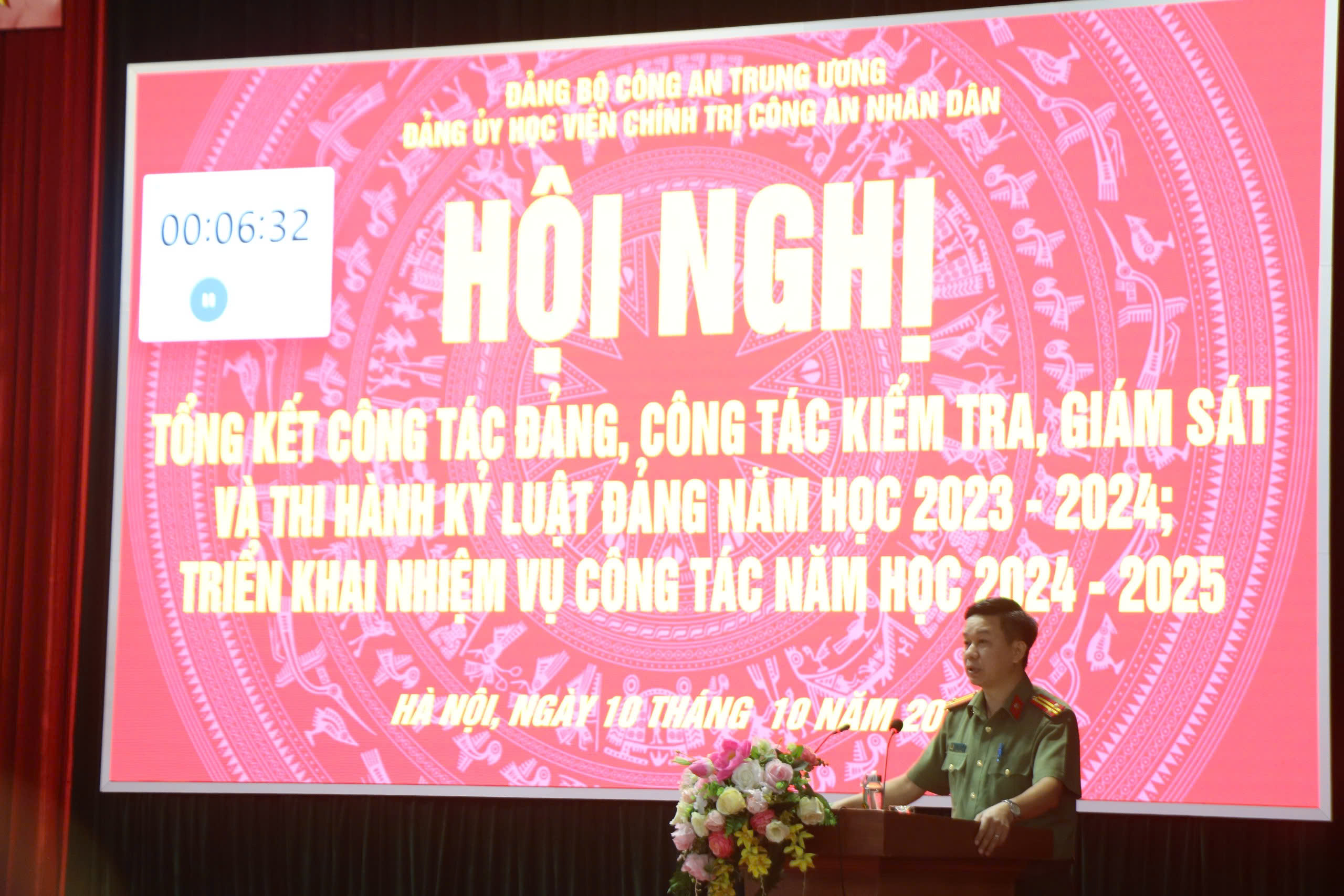 Tại Hội nghị, các đại biểu đã được nghe báo cáo tổng kết công tác đảng, công tác kiểm tra, giám sát và thi hành kỷ luật đảng năm học 2023-2024 của Đảng bộ Học viện. Năm học 2023-2024 dưới sự quan tâm, chỉ đạo sát sao của Đảng ủy CATW, lãnh đạo Bộ Công an, sự phối hợp, giúp đỡ của các cơ quan, đơn vị chức năng, toàn thể đội ngũ cán bộ, đảng viên đã đoàn kết, nỗ lực, hoàn thành xuất sắc nhiệm vụ chính trị năm học đề ra, qua đó tạo được những dấu ấn, bước đột phá trong thực hiện nhiệm vụ chính trị với nhiều thành tích, kết quả có ý nghĩa quan trọng.