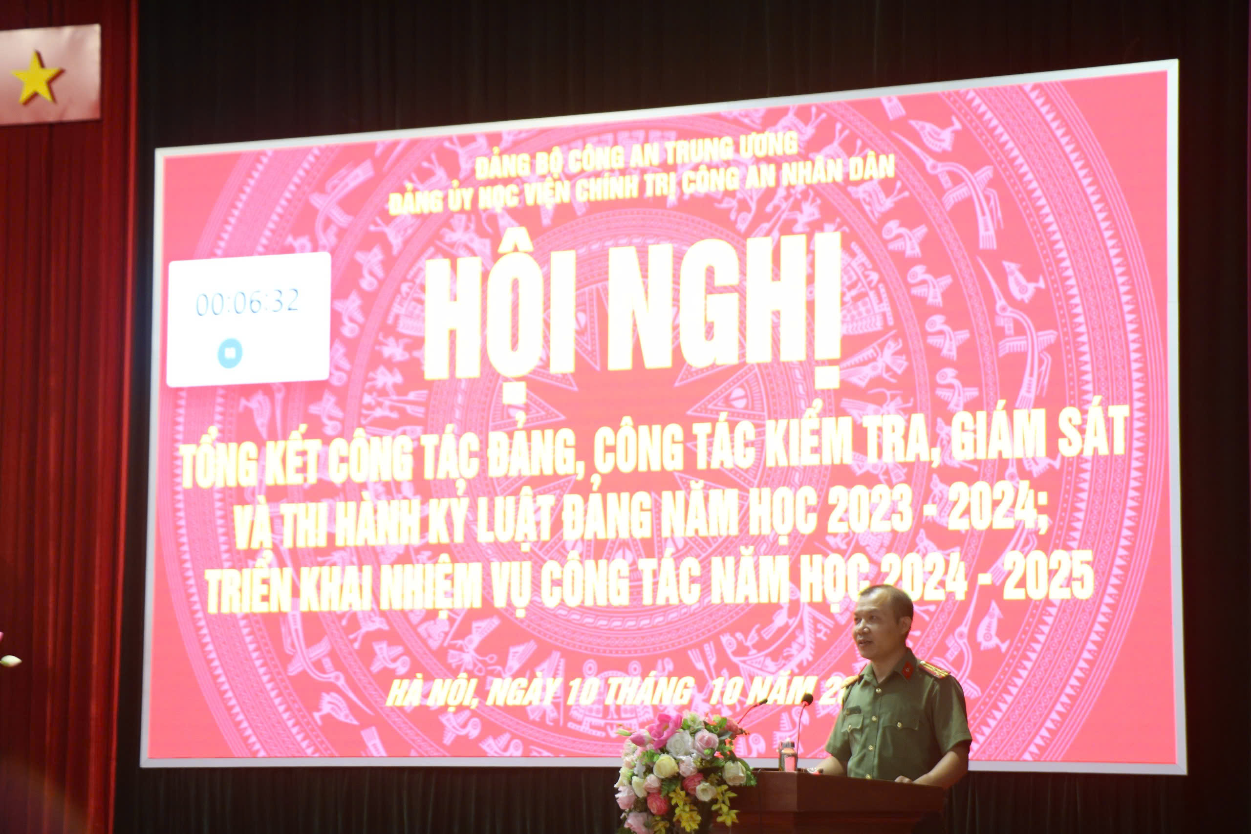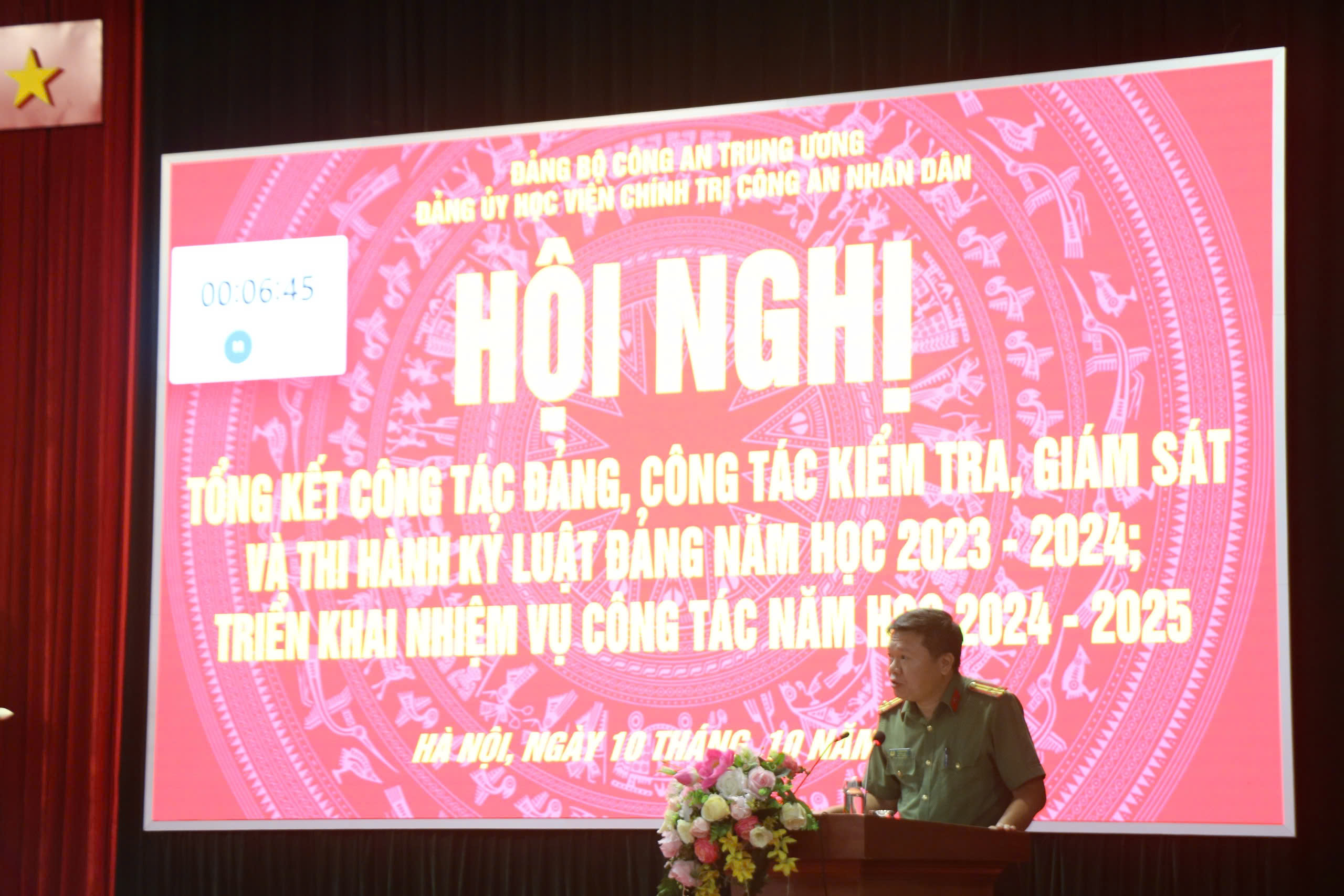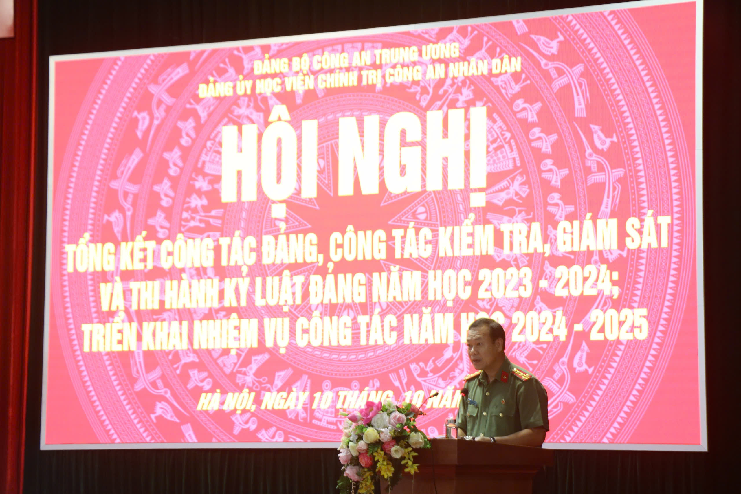 Phát biểu chỉ đạo tại Hội nghị, đồng chí Trung tướng, PGS. TS, Nhà giáo ưu tú Phan Xuân Tuy, Bí thư Đảng ủy, Giám đốc Học viện đã ghi nhận, biểu dương những nỗ lực, cố gắng, kết quả công tác của toàn thể cán bộ, đảng viên trong năm học vừa qua. Năm học 2024-2025 là năm cuối của nhiệm kỳ Đại hội Đảng bộ Học viện lần thứ II, do đó đồng chí Bí thư Đảng ủy, Giám đốc Học viện đề nghị đơn vị chức năng tập trung triển khai các hoạt động chuẩn bị cho Đại hội đảng các cấp, tiến tới tổ chức thành công Đại hội Đảng bộ Học viện Chính trị CAND lần thứ III, nhiệm kỳ 2025-2030. Đồng thời, quán triệt và triển khai nghiêm túc các chỉ tiêu, nhiệm vụ công tác năm học 2024-2025, phấn đấu hoàn thành xuất sắc các nhiệm vụ chính trị được giao./.