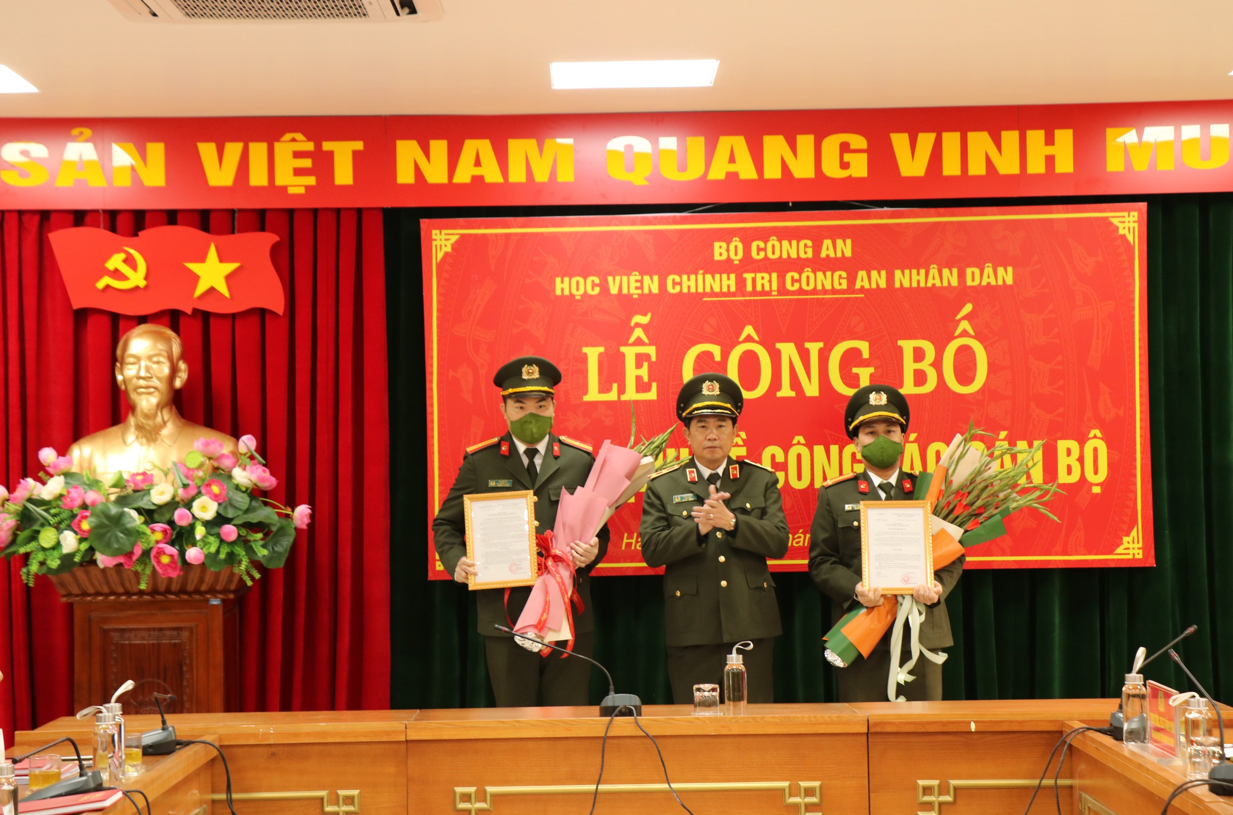 Đồng chí Trung tướng, PGS. TS Trần Vi Dân, Bí thư Đảng ủy, Giám đốc Học viện trao quyết định, tặng hoa chúc mừng cho 02 đồng chí được điều động, bổ nhiệm