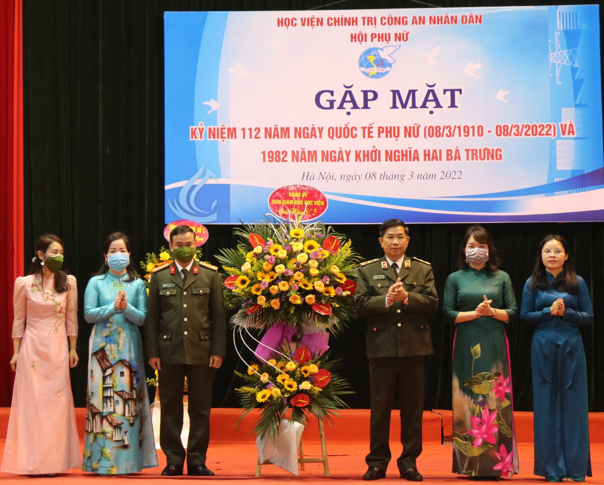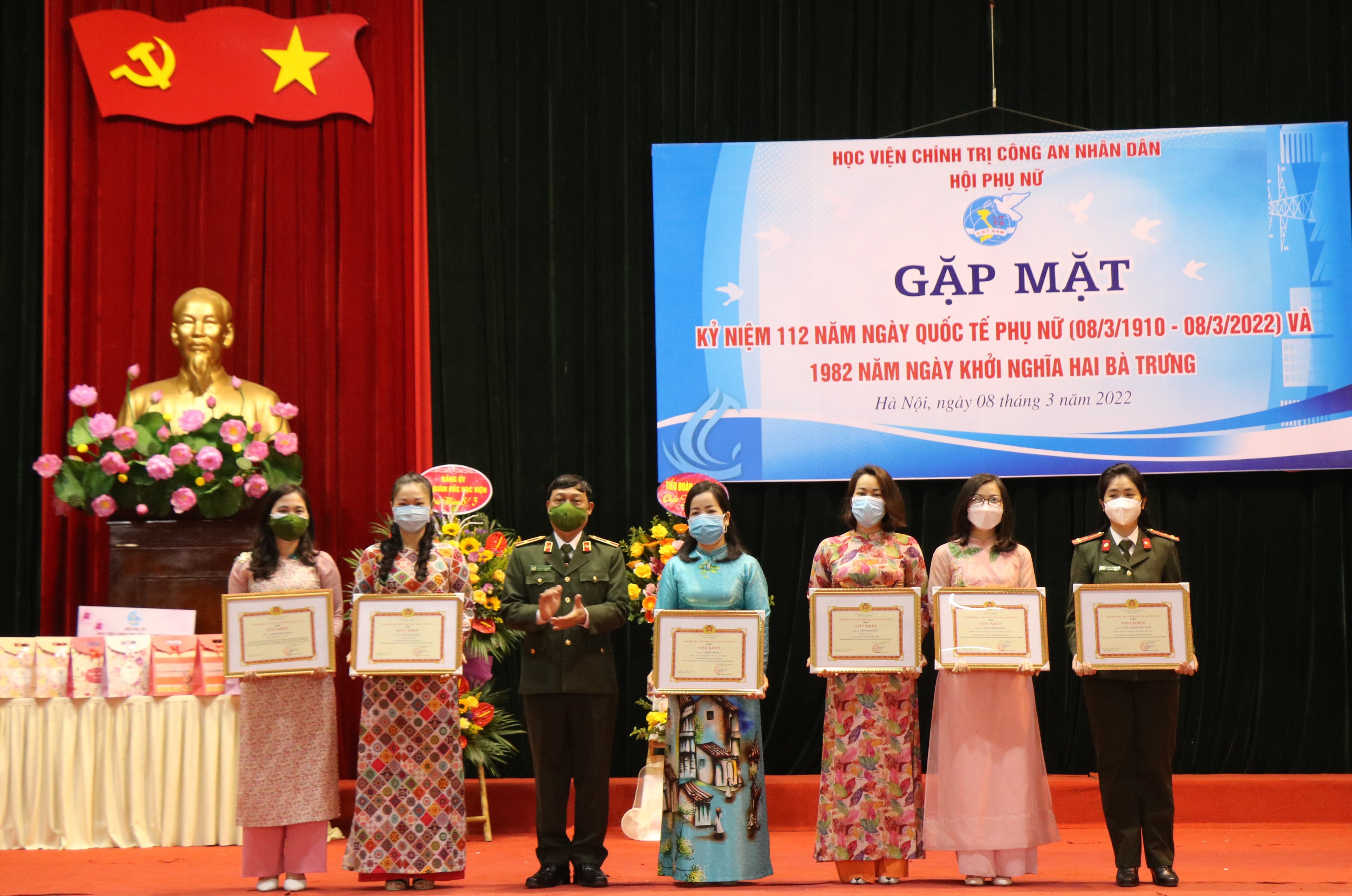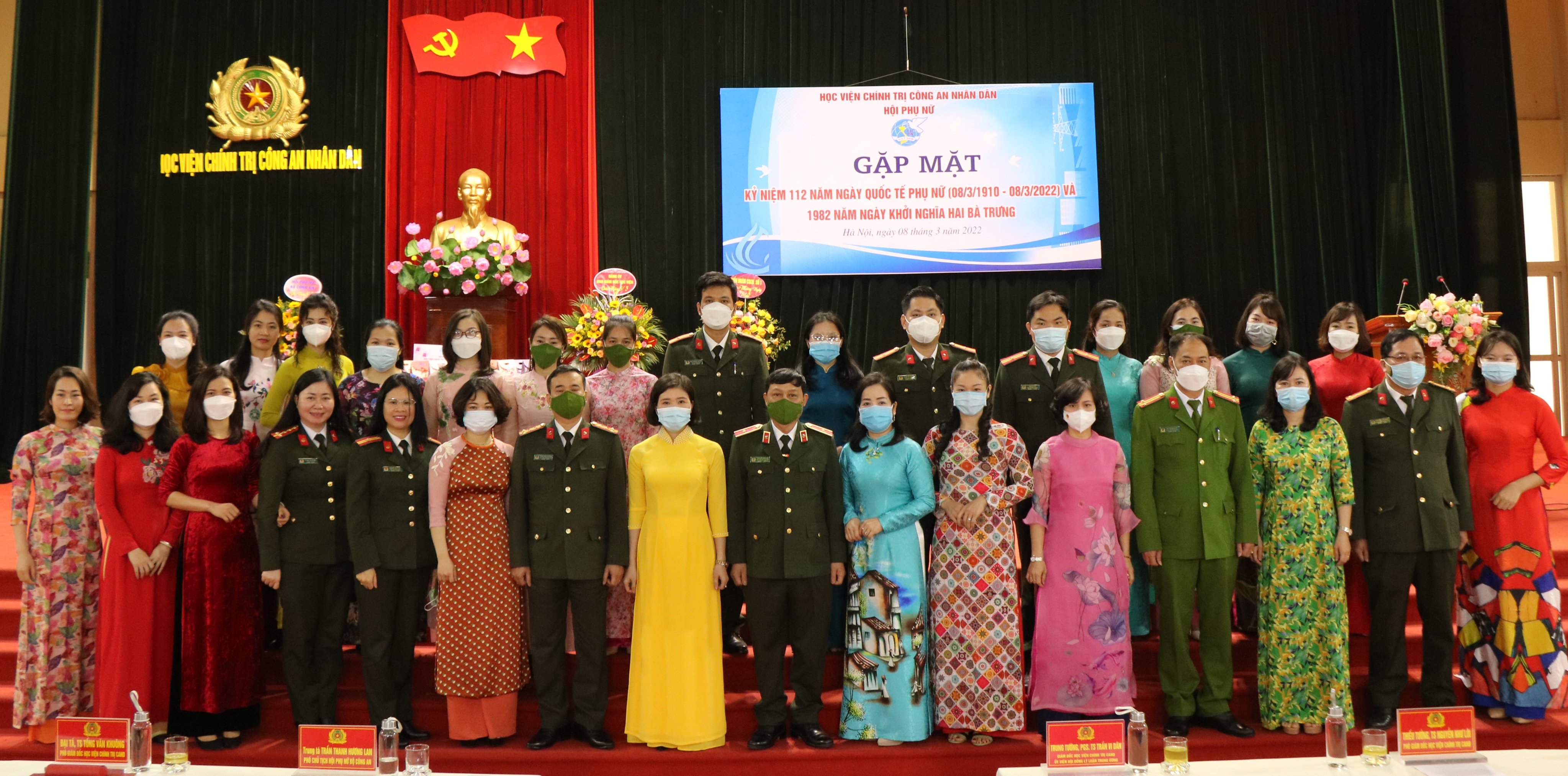 Sáng ngày 08/3/2022, tại Học viện Chính trị CAND, Hội Phụ nữ Học viện đã tổ chức Gặp mặt Kỷ niệm 112 năm ngày Quốc tế Phụ nữ 08/3, 1982 năm ngày Khởi nghĩa Hai Bà Trưng và triển khai công tác Hội và phong trào phụ nữ năm 2022. Dự và chỉ đạo buổi lễ, về phía Học viện Chính trị CAND có đồng chí Trung tướng, PGS.TS Trần Vi Dân, Bí thư Đảng ủy, Giám đốc Học viện; đồng chí Thiếu tướng, TS Nguyễn Như Lôi, Ủy viên BTV Đảng ủy, Phó Giám đốc Học viện, đồng chí Đại tá, TS Tống Văn Khuông, Ủy viên BTV Đảng ủy, Phó Giám đốc Học viện. Về phía đại biểu khách mời có đồng chí Trung tá Trần Thanh Hương Lan, Phó Chủ tịch Hội Phụ nữ Bộ Công an, đồng chí Trung tá Mè Quang Điệp, Trung đoàn Cảnh sát cơ động số 1, Bộ Tư lệnh Cảnh sát cơ động. Tham dự chương trình còn có đại diện lãnh đạo các đơn vị, các tổ chức quần chúng thuộc Học viện và toàn thể hội viên phụ nữ Học viện.