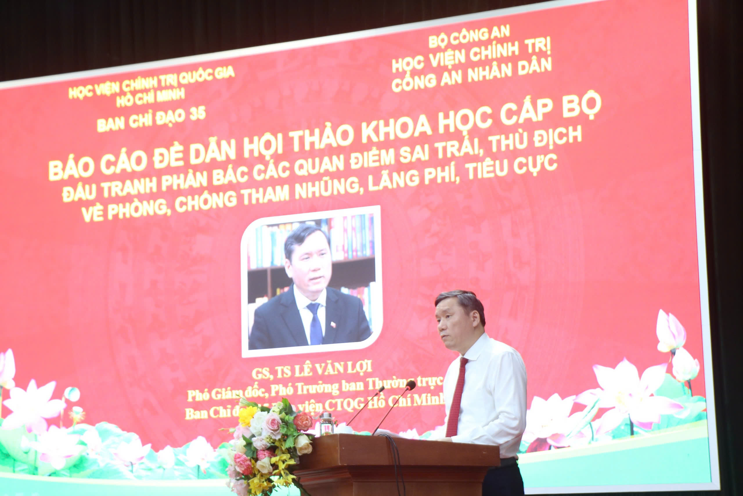 Phát biểu khai mạc, đề dẫn tại hội thảo, GS.TS Lê Văn Lợi, Phó Giám đốc Học viện Chính trị quốc gia Hồ Chí Minh nêu rõ: Phòng, chống tham nhũng, lãng phí, tiêu cực được xác định là một cuộc chiến chống “giặc nội xâm”. Do đó, thời gian qua Việt Nam đã đạt được nhiều kết quả to lớn cả trong xây dựng, hoàn thiện chủ trương, chính sách, pháp luật cũng như thực tiễn công tác phòng, chống tham nhũng, lãng phí, tiêu cực, góp phần xây dựng Đảng và hệ thống chính trị ngày càng trong sạch, vững mạnh; tạo động lực to lớn cho sự nghiệp đổi mới, tạo tiền đề vững chắc để Việt Nam bước vào kỷ nguyên phát triển mới. Tuy nhiên, thực tiễn khách quan cho thấy, tình trạng tham nhũng, lãng phí, tiêu cực trong nội bộ hệ thống chính trị và khu vực ngoài nhà nước vẫn diễn biến hết sức phức tạp. Dưới sự lãnh đạo, chỉ đạo đúng đắn, quyết liệt của Đảng, nhiều vụ án, vụ việc tham nhũng, lãng phí, tiêu cực đã bị phát hiện; thậm chí một số cán bộ lãnh đạo cấp cao có vi phạm, khuyết điểm đã bị xử lý kỷ luật, xử lý về pháp luật. Lợi dụng thực trạng đó, các thế lực thù địch, phản động, cơ hội chính trị trong và ngoài nước tung ra nhiều quan điểm, luận điệu xuyên tạc, chống phá cuộc đấu tranh phòng, chống tham nhũng, lãng phí, tiêu cực của Đảng, Nhà nước ta, gây hoang mang trong dư luận, một bộ phận người dân. Do đó, việc tổ chức hội thảo nhằm tạo diễn đàn trao đổi, nghiên cứu, nhận diện các quan điểm, luận điệu xuyên tạc, đề ra luận cứ đấu tranh xác đáng, thuyết phục; đề xuất giải pháp tiếp tục đẩy mạnh phản bác có hiệu quả với các quan điểm sai trái, thù địch về phòng, chống tham nhũng, lãng phí, tiêu cực ở Việt Nam trong thời gian tới là rất cần thiết.