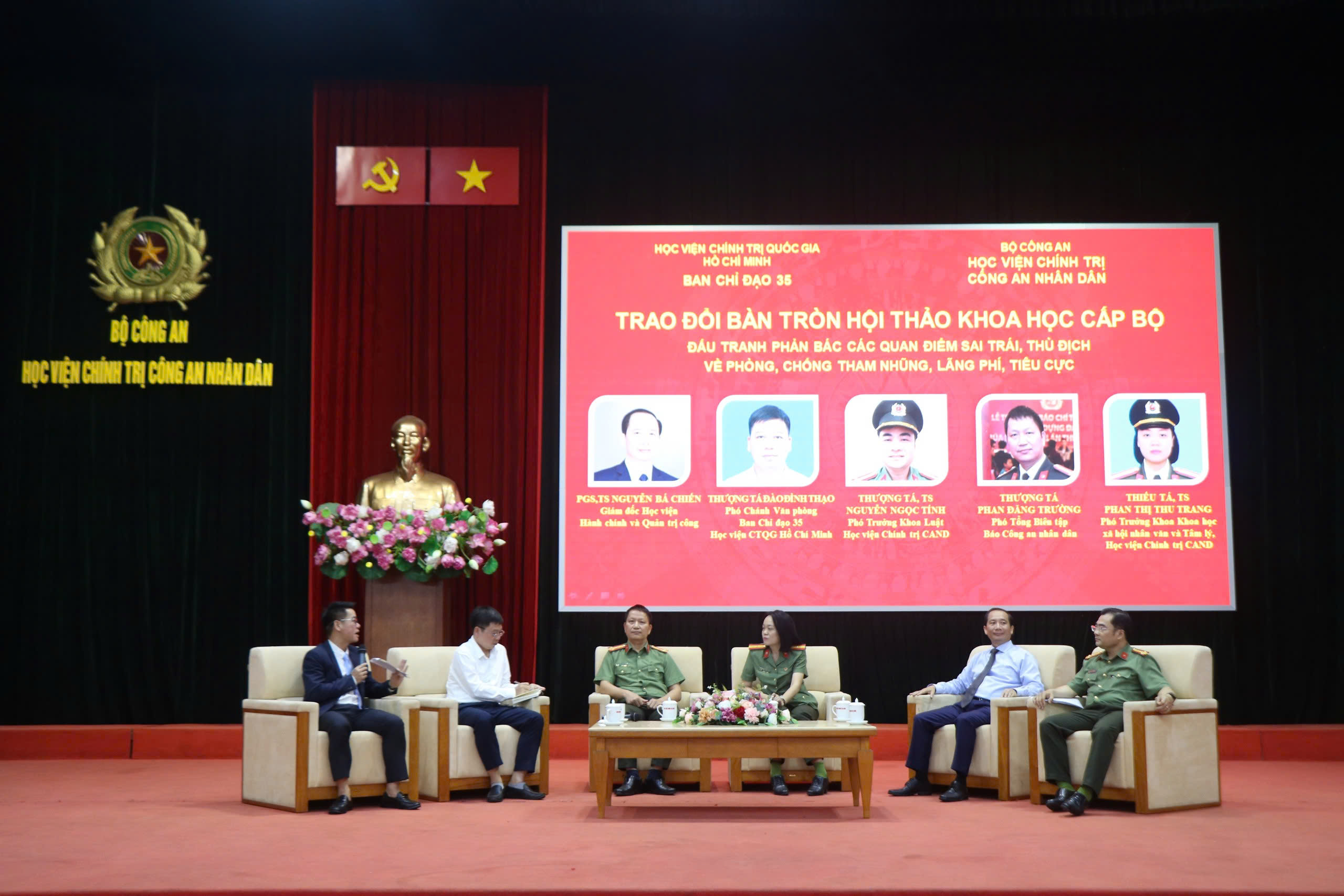 Hội thảo diễn ra theo 02 phiên. Phiên thứ nhất, các đại biểu phát biểu thảo luận theo hình thức trực tiếp tại hội trường với 08 ý kiến tham luận của các đồng chí lãnh đạo, chuyên gia, nhà khoa học trong và ngoài Công an nhân dân, các ý kiến tham luận đã tập trung làm rõ: (1) Quan điểm của chủ nghĩa Mác - Lênin, tư tưởng Hồ Chí Minh và của Đảng Cộng sản Việt Nam về phòng, chống tham nhũng, lãng phí, tiêu cực; (2) Nhận diện chiêu bài, thủ đoạn của các thế lực thù địch, phản động chống phá công tác phòng, chống tham nhũng, lãng phí, tiêu cực ở Việt Nam; (3) Luận cứ phản bác một số luận điệu xuyên tạc công tác phòng, chống tham nhũng, lãng phí, tiêu cực của Đảng, Nhà nước; (4) Hệ thống cơ chế, chính sách, pháp luật, cơ chế kiểm soát quyền lực trong phòng, chống tham nhũng, lãng phí, tiêu cực.