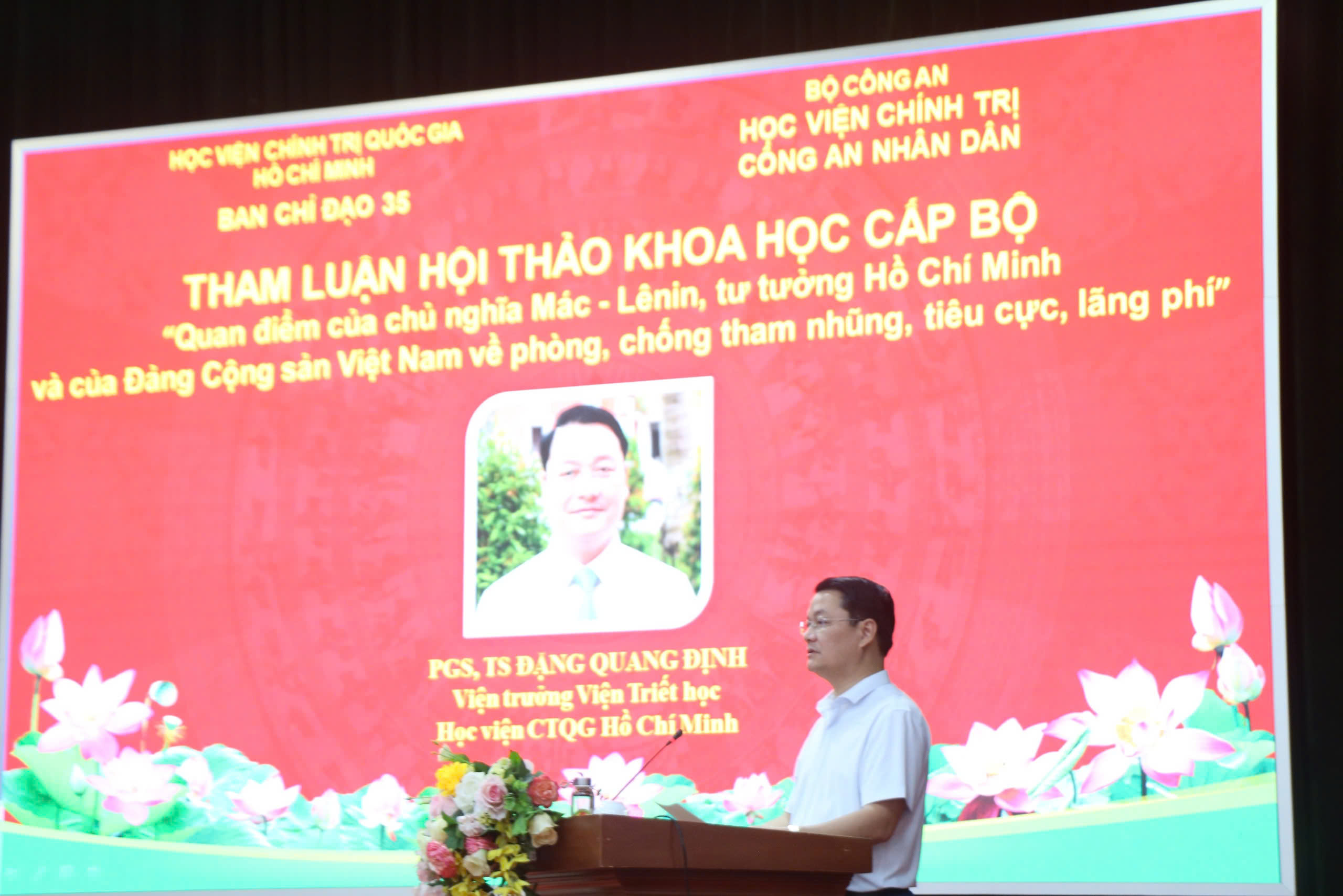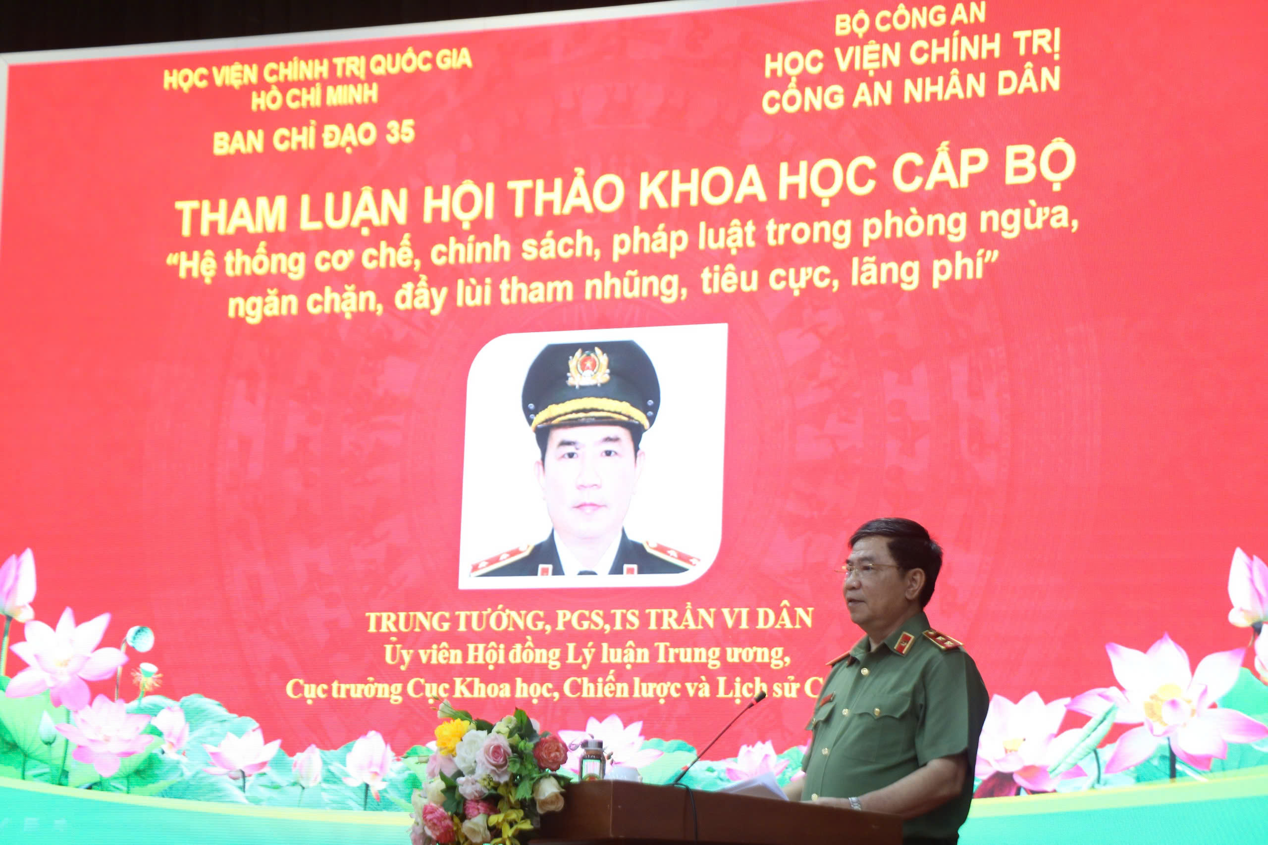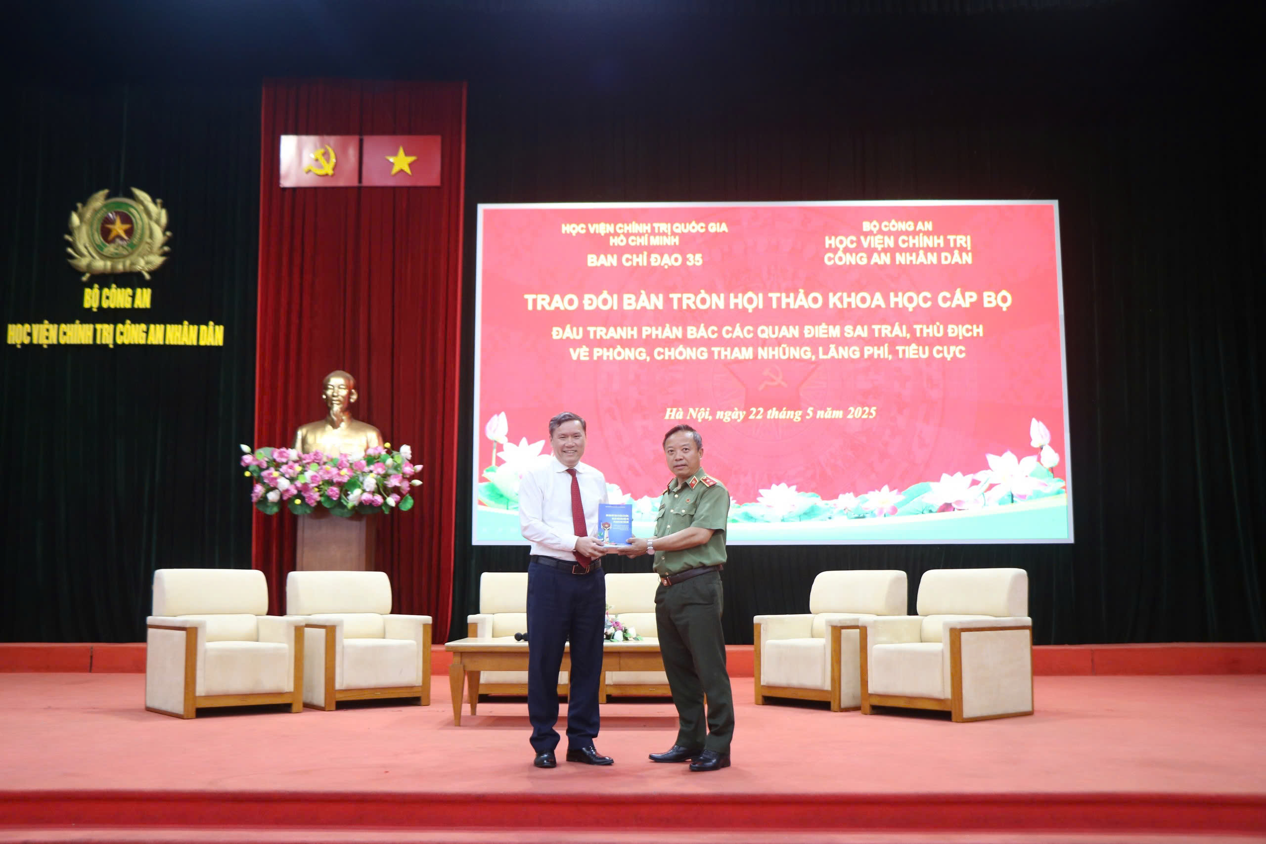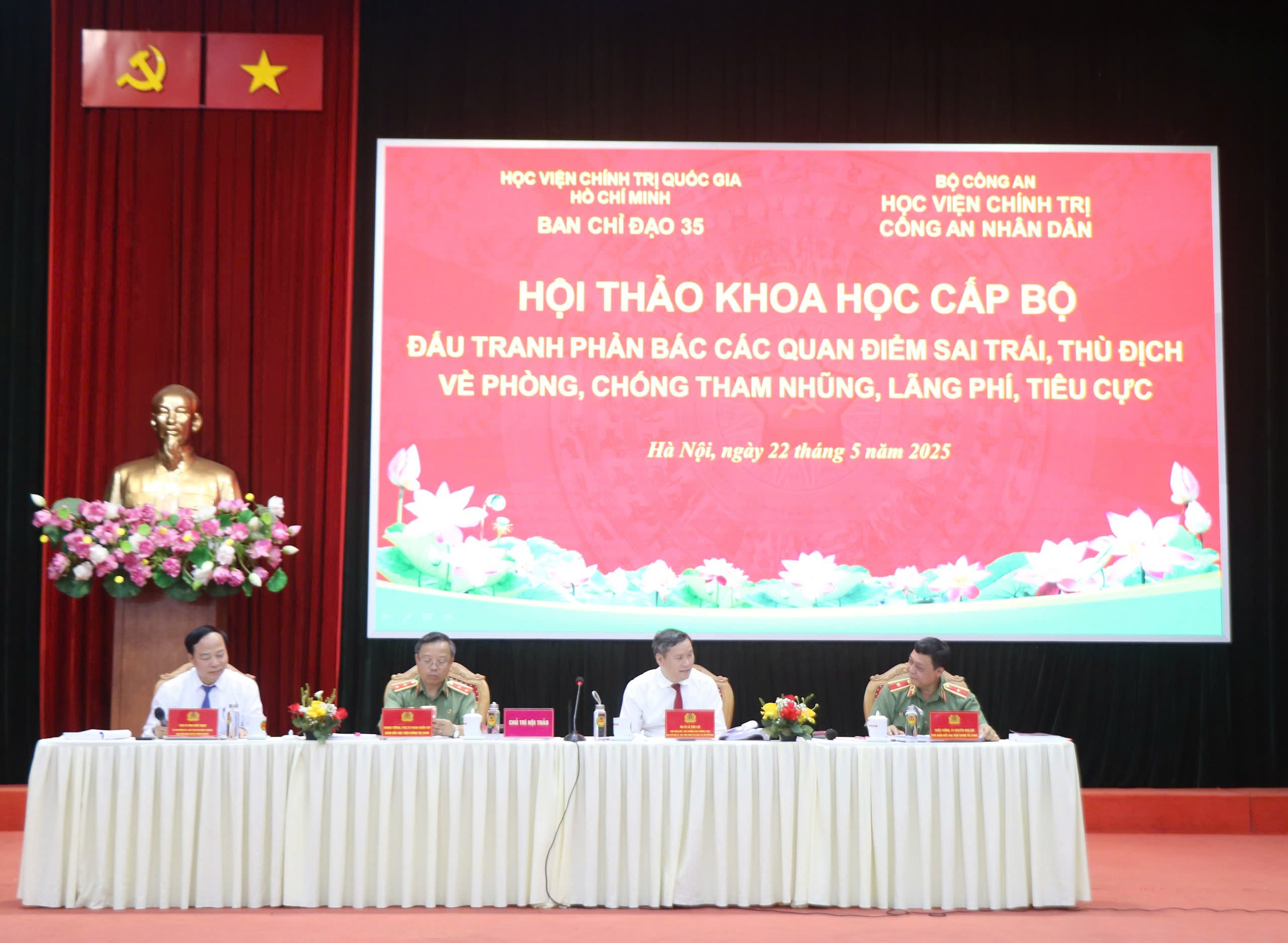 Ngày 22/5/2025, tại Học viện Chính trị Công an nhân dân, Ban Chỉ đạo 35, Học viện Chính trị quốc gia Hồ Chí Minh phối hợp với Học viện Chính trị Công an nhân dân tổ chức Hội thảo khoa học cấp Bộ với chủ đề: “Đấu tranh, phản bác quan điểm sai trái, thù địch về phòng, chống tham nhũng, lãng phí, tiêu cực”, nhằm tạo diễn đàn khoa học trao đổi, phân tích, nhận diện những âm mưu, thủ đoạn chống phá của các thế lực thù địch về công tác phòng, chống tham nhũng, lãng phí, tiêu cực ở Việt Nam; từ đó xây dựng các luận cứ đấu tranh xác đáng, thuyết phục; đồng thời trao đổi, thảo luận về những giải pháp tiếp tục phản bác có hiệu quả với các quan điểm sai trái, thù địch về phòng, chống tham nhũng, lãng phí, tiêu cực ở Việt Nam trong thời gian tới. Các đồng chí: GS.TS Lê Văn Lợi, Phó Giám đốc Học viện, Phó Trưởng Ban thường trực Ban chỉ đạo 35 Học viện Chính trị quốc gia Hồ Chí Minh; Trung tướng, PGS.TS, NGƯT Phan Xuân Tuy, Giám đốc Học viện Chính trị Công an nhân dân; PGS.TS Mai Đức Ngọc, Bí thư Đảng ủy, Chủ tịch Hội đồng trường Học viện Báo chí và Tuyên truyền; Thiếu tướng, TS Nguyễn Như Lôi, Phó Bí thư Đảng ủy, Phó Giám đốc Học viện Chính trị Công an nhân dân tham dự và Đồng chủ trì hội thảo.