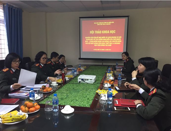 Ngày 28/12/2018, Khoa Triết học và Chủ nghĩa xã hội khoa học, Học viện Chính trị Công an nhân dân tổ chức Hội thảo khoa học “Nghiên cứu vấn đề nhà nước và cách mạng xã hội trong một số tác phẩm kinh điển của chủ nghĩa Mác - Lênin nhằm nâng cao năng lực chuyên môn cho đội ngũ giảng viên Khoa Triết học và Chủ nghĩa xã hội khoa học - Học viện Chính trị Công an nhân dân”. Tham dự Hội thảo có đại diện lãnh đạo các đơn vị thuộc Học viện cùng toàn thể giảng viên Khoa Triết học và Chủ nghĩa xã hội khoa học.