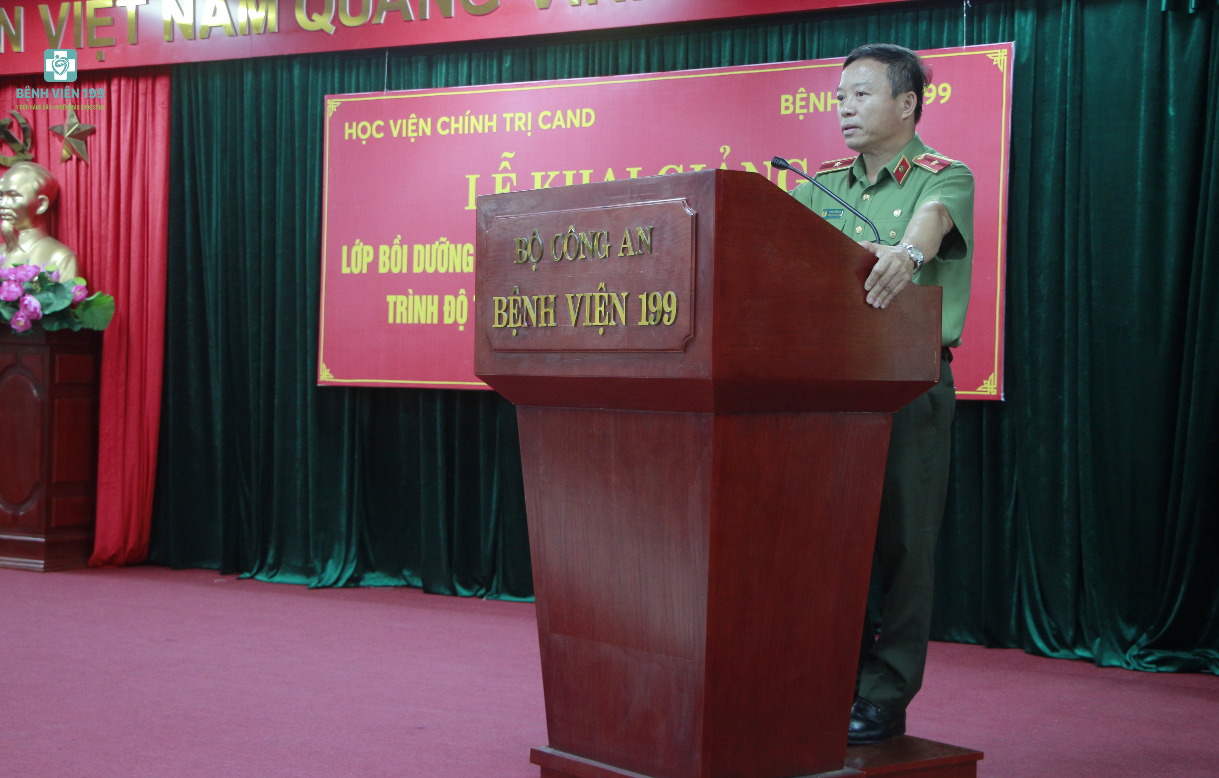 Tại buổi lễ khai giảng, thay mặt Đảng ủy, Ban Giám đốc Học viện, đồng chí Thiếu tướng, PGS.TS Phan Xuân Tuy, Bí thư Đảng ủy, Giám đốc Học viện Chính trị Công an nhân dân gửi lời cảm ơn Đảng ủy, Ban Giám đốc Bệnh viện 199, các đơn vị chức năng của Bệnh viện đã phối hợp chặt chẽ với Học viện trong công tác chiêu sinh và chuẩn bị các điều kiện khai giảng lớp học. Đồng thời, chào mừng các đồng chí học viên là cán bộ có trình độ, học vấn, chuyên môn nghiệp vụ, kinh nghiệm thực tiễn đã chính thức tham gia khóa học nhằm đáp ứng yêu cầu về bản lĩnh chính trị, phẩm chất đạo đức, kiến thức chuyên môn nghiệp vụ, xây dựng lực lượng CAND để phục vụ tốt công tác trong tình hình mới. Trong không khí thi đua của cả nước hướng tới chào mừng kỷ niệm 77 năm ngày Cách mạng tháng Tám (19/8/1945 - 19/8/2022) và Quốc khánh (2/9/1945 - 2/9/2022), 77 năm Ngày truyền thống lực lượng Công an nhân dân Việt Nam (19/8/1945 - 19/8/2022), 17 năm Ngày hội toàn dân bảo vệ An ninh Tổ quốc (19/8/2005 - 19/8/2022) và khai giảng năm học mới (2022 - 2023), các đồng chí học viên cần nhận thức rõ được sự ưu tiên của lãnh đạo Bộ Công an và các đơn vị chức năng khi giao chỉ tiêu mở lớp tại Bệnh viện 199 - trung tâm công nghệ cao trong hoạt động khám chữa bệnh cũng như tuyến đầu trong chống dịch Covid-19. Do tính chất và đặc điểm nghề nghiệp công tác, thời gian học tập không nhiều vì vậy đồng chí Giám đốc Học viện yêu cầu các đồng chí học viên cần nhận thức đúng đắn và đầy đủ mục tiêu, yêu cầu của khóa học, nêu cao tinh thần trách nhiệm, tích cực nghiên cứu tìm tòi, sáng tạo, tập trung nghe giới thiệu chuyên đề, kết hợp với thực tiễn công tác và quá trình tự đào tạo để đạt được kết quả cao nhất.