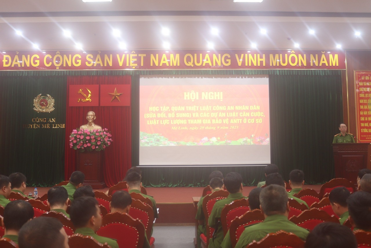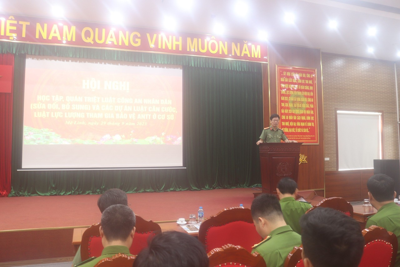 Tiếp nối chuỗi hoạt động tuyên truyền, phổ biến, giáo dục pháp luật hướng tới kỷ niệm Ngày pháp luật Việt Nam (9/11), chào mừng kỷ niệm 10 năm Ngày thành lập Học viện Chính trị CAND (01/3/2014 - 01/3/2024); triển khai Kế hoạch 444/KH-CAML-TH ngày 12/9/2023 của Công an huyện Mê Linh, thành phố Hà Nội về việc tổ chức Hội nghị học tập, quán triệt Luật Công an nhân dân năm 2018 (sửa đổi, bổ sung năm 2023) và tuyên truyền định hướng dự thảo các luật, gồm: Luật Căn cước và Luật Lực lượng tham gia bảo vệ an ninh, trật tự ở cơ sở. Được sự đồng ý của Ban Giám đốc Học viện, ngày 29/9/2023, Khoa Luật, Học viện Chính trị CAND đã phối hợp với Công an huyện Mê Linh, thành phố Hà Nội tổ chức Hội nghị quán triệt các nội dung trên cho hơn 300 cán bộ, chiến sĩ Công an huyện Mê Linh.