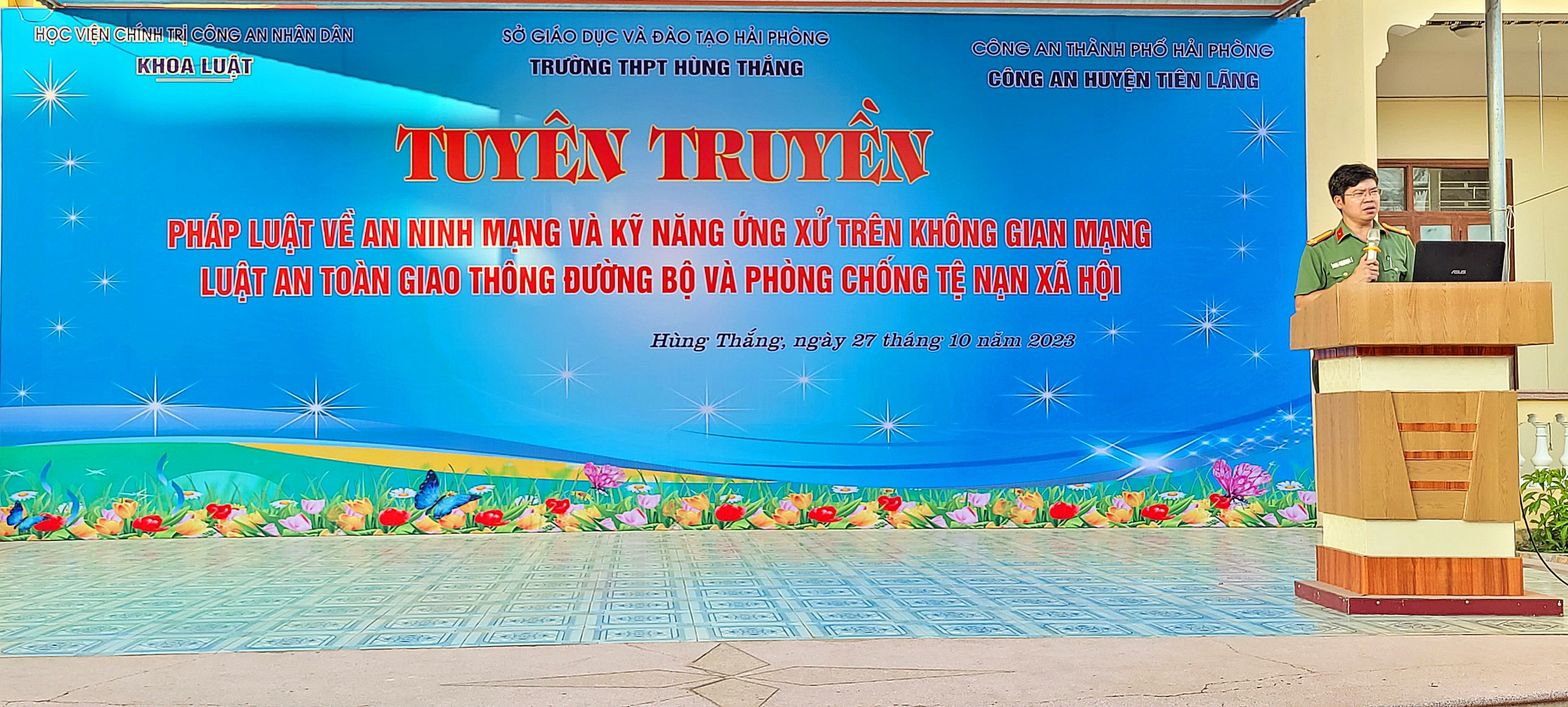 Ngày 27/10/2023, tại Trường THPT Hùng Thắng, Tiên Lãng, Hải Phòng, Khoa Luật phối hợp với Công an huyện Tiên Lãng, trường THPT Hùng Thắng truyên truyền Pháp luật về An ninh mạng và kỹ năng ứng xử trên không gian mạng; Luật an toàn giao thông đường bộ và phòng chống tệ nạn xã hội. Tham dự buổi tuyên truyền, về phía Công an huyện, đồng chí Thượng tá Trần Thanh Hải, Phó Trưởng Công an Huyện và Đội CSGT; về phía Nhà trường, ông Vũ Văn Chiến, Bí thư Đảng ủy, Hiệu trưởng Trường THPT Hùng Thắng và toàn thể giáo viên, học sinh. Tại buổi tuyên truyền, đồng chí Trung tá, TS Ngô Văn Vịnh đã truyền đạt những nội dung cơ bản được quy định trong Luật An ninh mạng năm 2018, các thủ đoạn tội phạm trên không gian mạng hiện nay, hướng dẫn cho các em học sinh những kỹ năng sử dụng mạng xã hội an toàn.