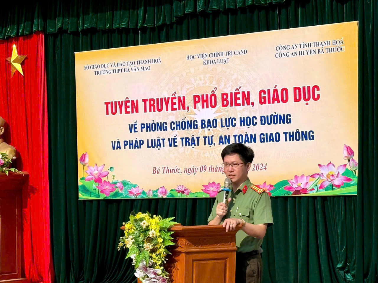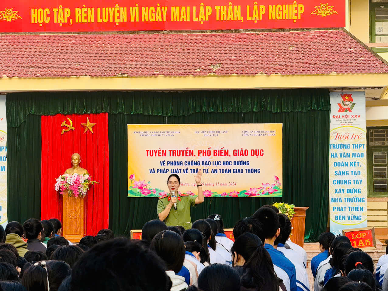 Thực hiện Chương trình Công tác năm học 2024 - 2025, triển khai thực hiện Kế hoạch số 2068/KH-T03-P1, ngày 23/10/2024 của Học viện Chính trị Công an nhân dân về việc tổ chức Ngày Pháp luật nước Cộng hòa xã hội chủ nghĩa Việt Nam trong Học viện Chính trị Công an nhân dân năm 2024. Ngày 9/11/2024, Khoa Luật, Học viện Chính trị Công an nhân dân tổ chức tuyên truyền, phổ biến, giáo dục pháp luật cho học sinh Trường THPT Hà Văn Mao, xã Điền Trung, huyện Bá Thước, tỉnh Thanh Hóa.