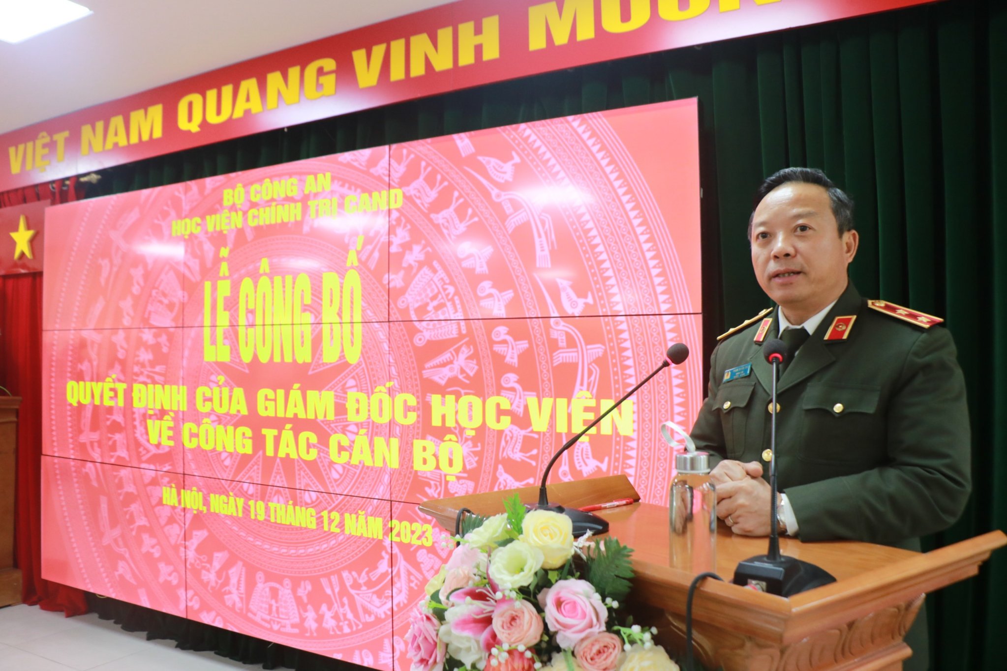 Phát biểu tại buổi lễ, đồng chí Trung tướng, PGS. TS Phan Xuân Tuy, Bí thư Đảng uỷ, Giám đốc Học viện đã đánh giá quy trình bổ nhiệm, điều động bổ nhiệm 5 đồng chí giữ chức vụ lãnh đạo, chỉ huy đã được thực hiện đảm bảo nguyên tắc công khai, dân chủ, minh bạch theo đúng quy định của Bộ Công an; cán bộ được bổ nhiệm đều là những đồng chí trong quy hoạch, nhận được tỉ lệ tín nhiệm cao của tập thể lãnh đạo, cán bộ, giảng viên trong đơn vị; khẳng định bản lĩnh chính trị vững vàng, tâm huyết và trách nhiệm với công việc. Việc được bổ nhiệm, điều động bổ nhiệm giữ các chức vụ lãnh đạo là sự ghi nhận, đánh giá của Đảng uỷ, Ban Giám đốc đối với sự nỗ lực, phấn đấu của các đồng chí trong quá trình công tác, chúc mừng các đồng chí được bổ nhiệm, đồng chí Bí thư Đảng uỷ, Giám đốc Học viện cũng yêu cầu các đồng chí cán bộ tiếp tục nêu cao tinh thần trách nhiệm tích cực hoàn thiện bản thân trên tất cả các mặt: Phẩm chất chính trị, đạo đức, lối sống, ý thức tổ chức kỷ luật và việc thực hiện các quy định nêu gương của cán bộ, đảng viên; năng lực công tác, đoàn kết cùng tập thể lãnh đạo các đơn vị hoàn thành tốt chức trách nhiệm vụ được giao trên cương vị mới, đóng góp vào việc hoàn thành xuất sắc nhiệm vụ chính trị chung của Học viện Chính trị Công an nhân dân.