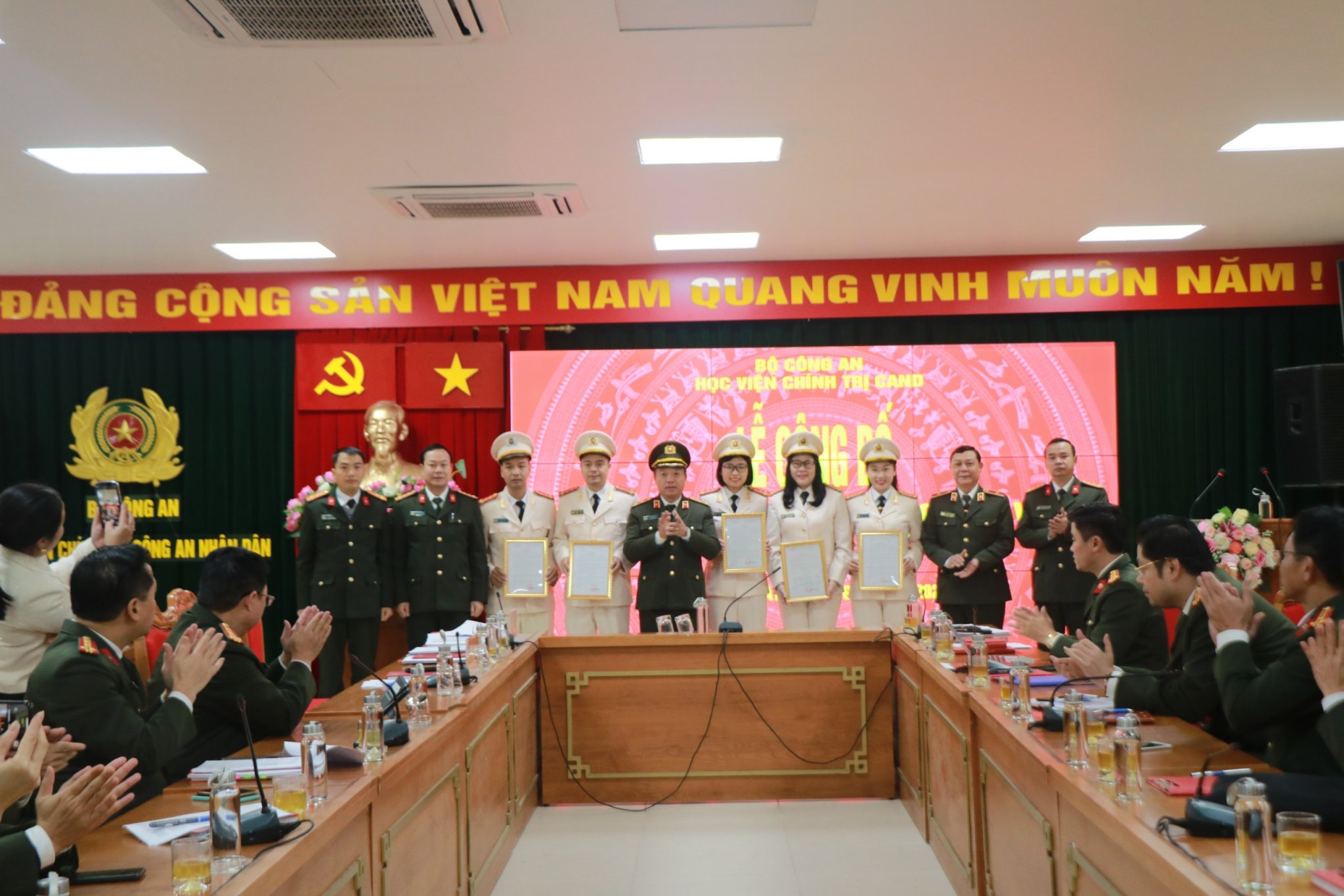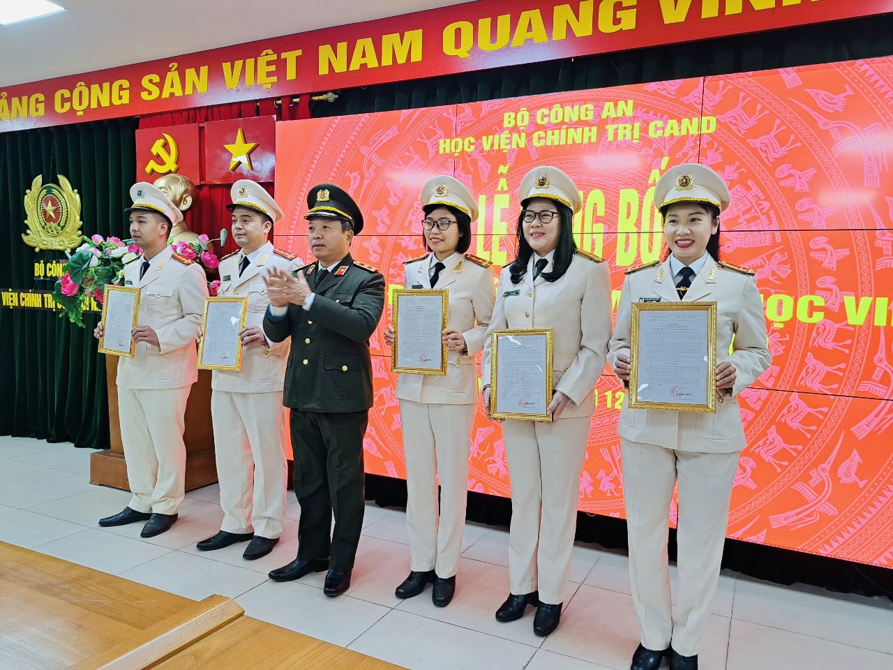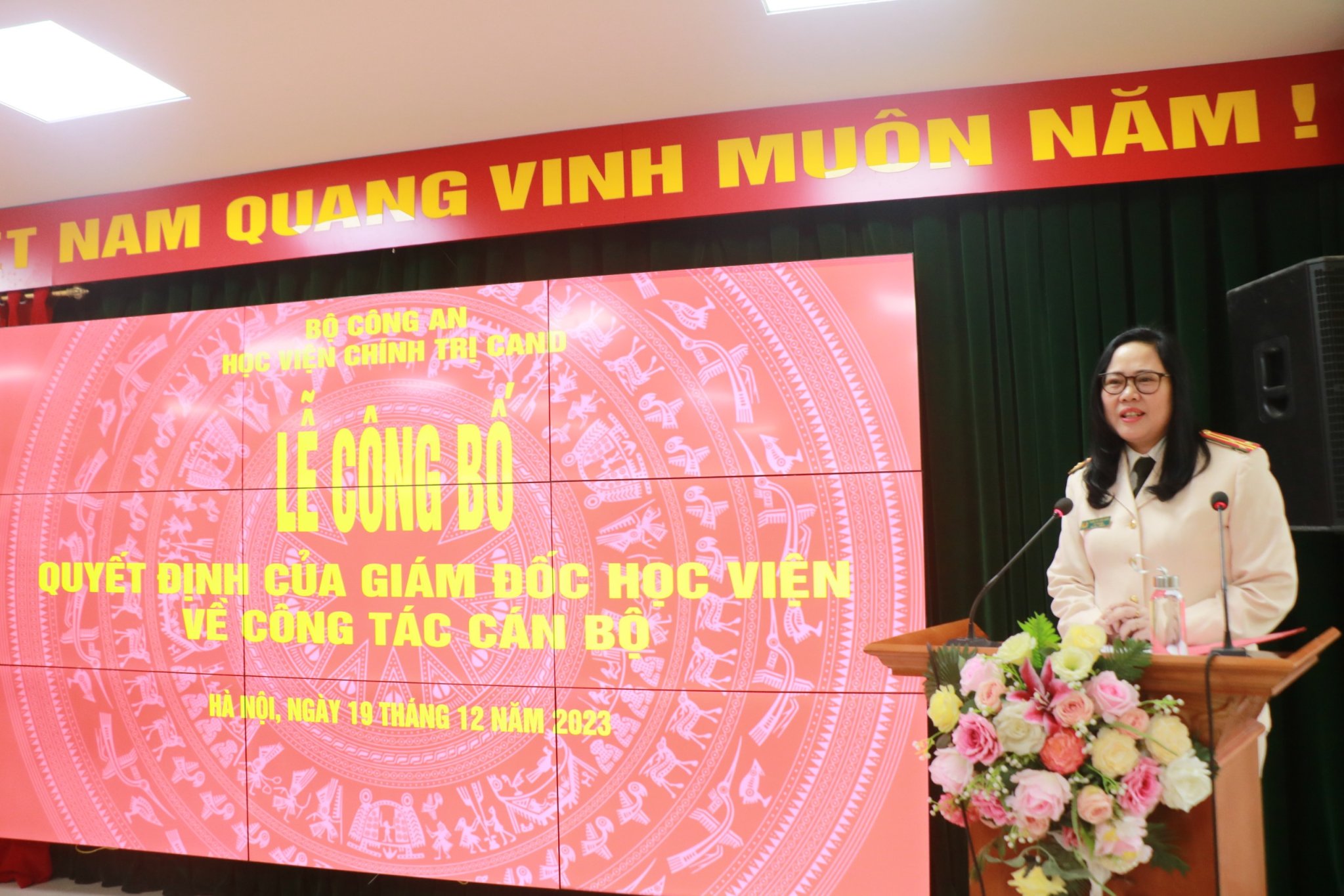 Tại buổi lễ, lãnh đạo Phòng Chính trị đã công bố quyết định của Giám đốc Học viện Chính trị CAND về việc: điều động và bổ nhiệm đồng chí Thượng tá Nguyễn Thị Thủy, chuyên viên cao cấp Phòng Quản lý học viên giữ chức vụ Phó Giám đốc Trung tâm Lưu trữ và Thư viện; điều động và bổ nhiệm đồng chí Thượng tá Trần Thị Kim Oanh, chuyên viên cao cấp Phòng Chính trị giữ chức vụ Phó Trưởng phòng, Phòng Bảo đảm chất lượng đào tạo; bổ nhiệm đồng chí Đại úy Vũ Đức Cường, giảng viên khoa Kinh tế chính trị giữ chức vụ Phó Trưởng khoa Kinh tế chính trị; bổ nhiệm đồng chí Đại úy Phạm Hà Phương, giảng viên Khoa Ngoại ngữ - tin học giữ chức vụ Phó Trưởng Khoa Ngoại ngữ - Tin học; bổ nhiệm đồng chí Đại úy Nguyễn Văn Lũy, cán bộ Văn phòng giữ chức vụ Phó Đội trưởng Đội Viễn thông, tin học, cơ yếu, Văn phòng Học viện.