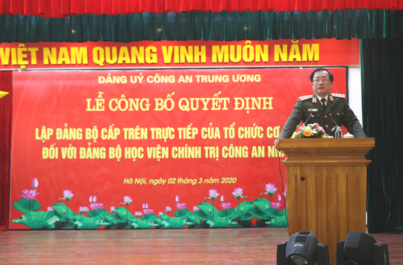 Ngày 02/3/2020, Văn phòng Đảng ủy Công an Trung ương chủ trì, phối hợp với Đảng ủy Học viện Chính trị Công an nhân dân long trọng tổ chức Lễ công bố Quyết định của Đảng ủy Công an Trung ương lập đảng bộ cấp trên trực tiếp của tổ chức cơ sở đảng đối với Đảng bộ Học viện Chính trị Công an nhân dân. Đồng chí Thượng tướng, PGS.TS Nguyễn Văn Thành, Ủy viên Trung ương Đảng, Ủy viên Ban Thường vụ Đảng ủy Công an Trung ương, Chủ nhiệm Ủy ban Kiểm tra Đảng ủy Công an Trung ương, Thứ trưởng Bộ Công an dự, chỉ đạo buổi Lễ. Về phía các đại biểu khách mời có các đồng chí: Thiếu tướng Lê Quốc Hùng, Phó Chủ nhiệm Thường trực Ủy ban Kiểm tra Đảng ủy Công an Trung ương; Thiếu tướng Nguyễn Đức Minh, Phó Cục trưởng Cục Công tác đảng và công tác chính trị; Đại tá Vũ Hữu Tài, Phó Chánh Văn phòng Đảng ủy Công an Trung ương, Phó Chánh Văn phòng Bộ Công an và đại diện các phòng chức năng của Văn phòng Đảng ủy Công an Trung ương; Cục Công tác đảng và công tác chính trị; Ủy ban Kiểm tra Đảng ủy Công an Trung ương.