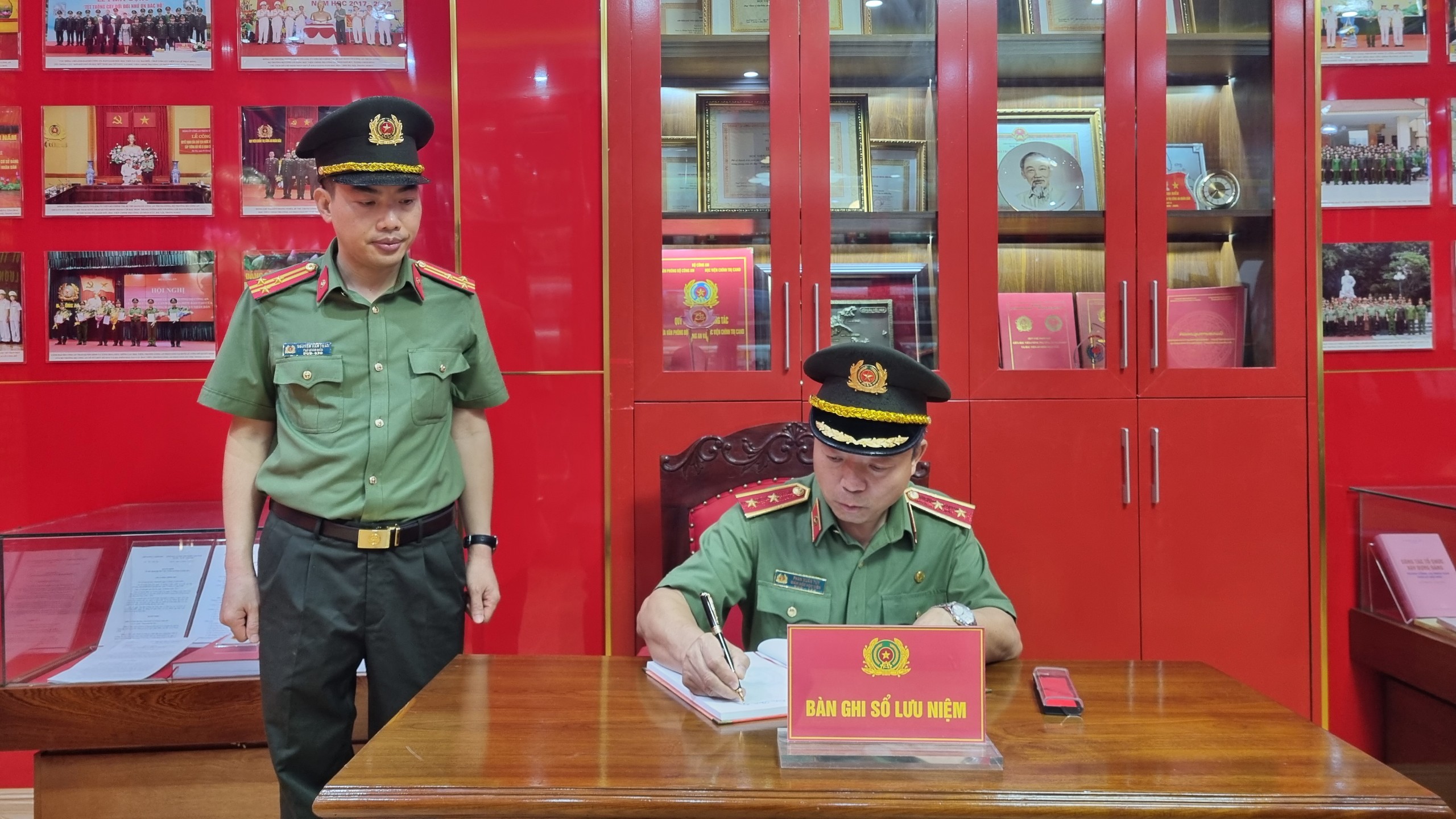 Đồng chí Trung tướng, PGS.TS Phan Xuân Tuy, Bí thư Đảng ủy, Giám đốc Học viện ghi sổ lưu niệm tại Phòng truyền thống mới.