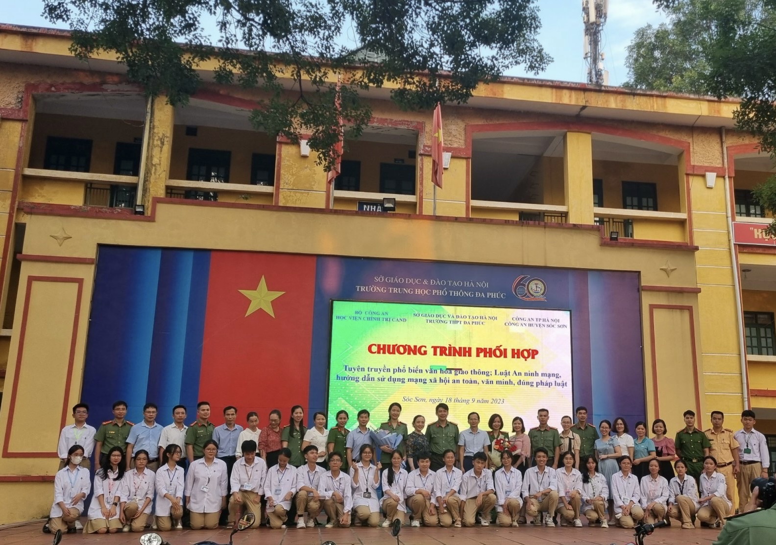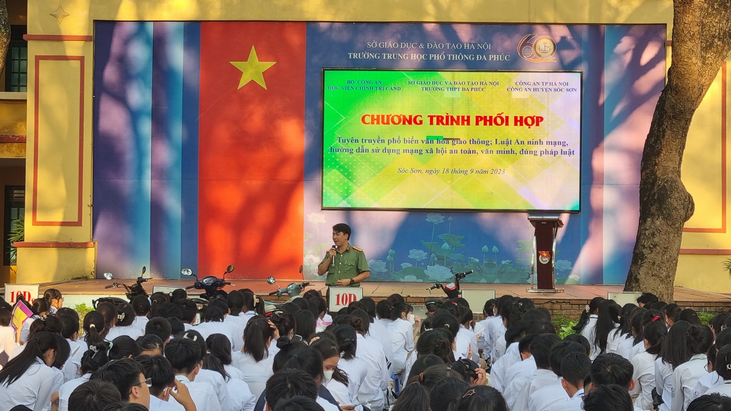 Ngày 18/9/2023, Học viện Chính trị CAND phối hợp với Công an huyện Sóc Sơn, Tp. Hà Nội tổ chức tuyên truyền, phổ biến văn hóa giao thông; Luật An ninh mạng, hướng dẫn sử dụng mạng xã hội an toàn, văn minh, đúng pháp luật cho cán bộ, giáo viên và học sinh trường THPT Đa Phúc, huyện Sóc Sơn, Tp. Hà Nội. Thành phần tham dự buổi tuyên truyền: