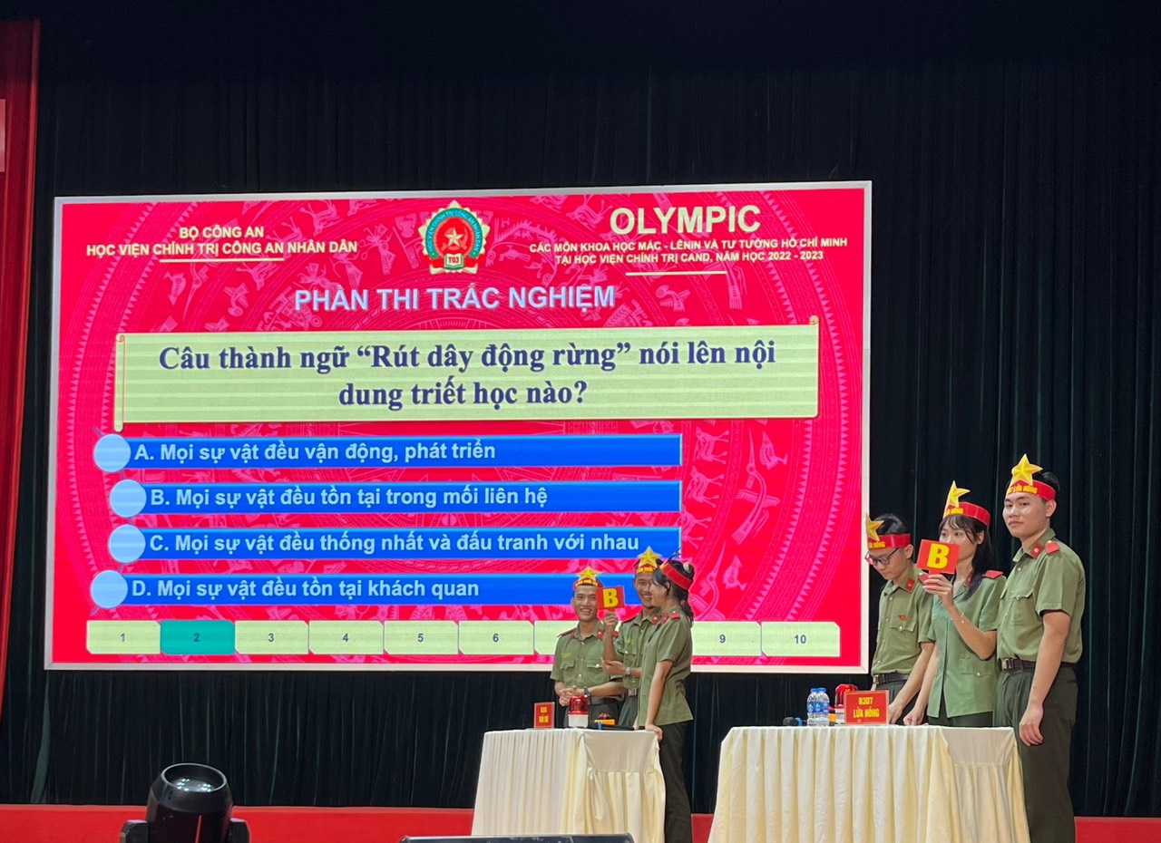 Thực hiện chỉ thị nêu trên, Đảng ủy Công an Trung ương đã ban hành nhiều chỉ thị, nghị quyết, kế hoạch nhằm đẩy mạnh phong trào học tập, nghiên cứu, vận dụng và phát triển chủ nghĩa Mác - Lênin, tư tưởng Hồ Chí Minh trong toàn lực lượng. Trên tinh thần đó, ngày 31/10/2022, Học viện Chính trị CAND đã ban hành kế hoạch số 2531/KH- T03-P3 về việc tổ chức các hoạt động đẩy mạnh phong trào thi đua dạy giỏi, học tập và rèn luyện tốt trong Học viện Chính trị CAND năm học 2022 - 2023; đồng thời, để triển khai nhiệm vụ năm học 2022 - 2023, ngày 17/3/2023, đồng chí Giám đốc Học viện đã ban hành Kế hoạch số: 545/KH-T03-K1về việc tổ chức Cuộc thi Olympic các môn Khoa học Mác - Lênin, Tư tưởng Hồ Chí Minh tại Học viện Chính trị CAND năm học 2022 - 2023, giao nhiệm vụ cho Khoa Triết học và CNXHKH là đơn vị thường trực tổ chức Cuộc thi.