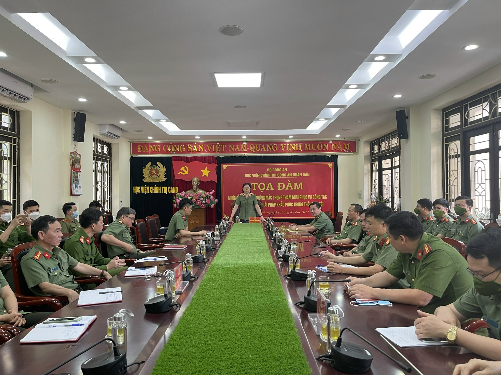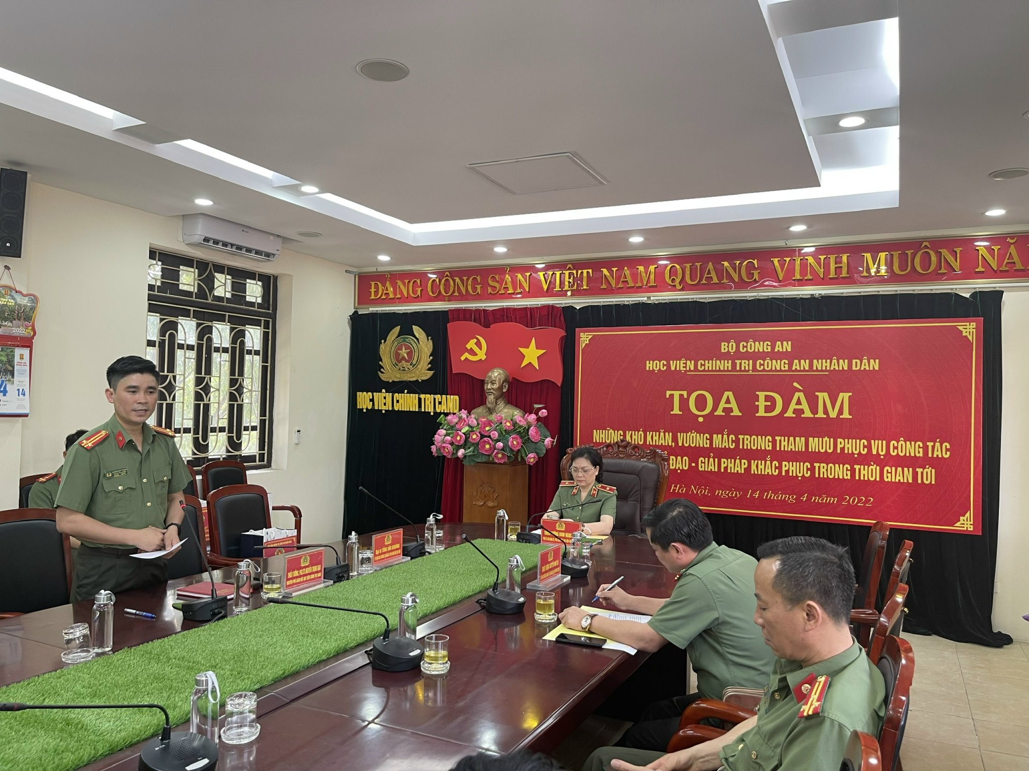 Bám sát chủ đề Tọa đàm, đại diện các đơn vị tham dự đã phát biểu ý kiến, bên cạnh việc khẳng định vị trí, vai trò, kết quả các mặt công tác tham mưu đạt được thời gian qua đến nhấn mạnh sự lãnh đạo các đơn vị nhà trường đã luôn quan tâm đến công tác tham mưu. Đồng thời, ý kiến phát biểu cũng chỉ rõ những khó khăn, vướng mắc, bất cập và nguyên nhân; từ đó đề xuất, kiến nghị các giải pháp nhằm nâng cao hiệu quả công tác tham mưu tại các Học viện, trường Công an nhân dân trong thời gian tới.