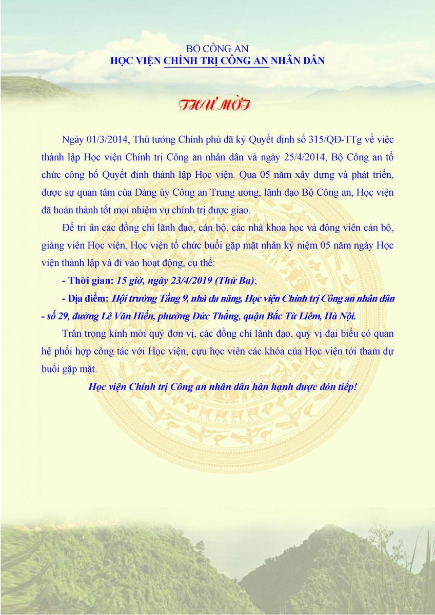 Thư mời gặp mặt kỷ niệm 05 năm ngày thành lập Học viện Chính trị Công an nhân dân