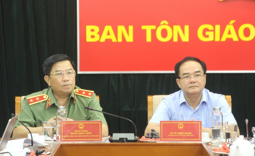 TS. Vũ Chiến Thắng, Trưởng ban Ban Tôn giáo Chính phủ và Trung tướng, PGS.TS Trần Vi Dân, Giám đốc Học viện Chính trị Công an Nhân dân đồng chủ trì buổi Tọa đàm