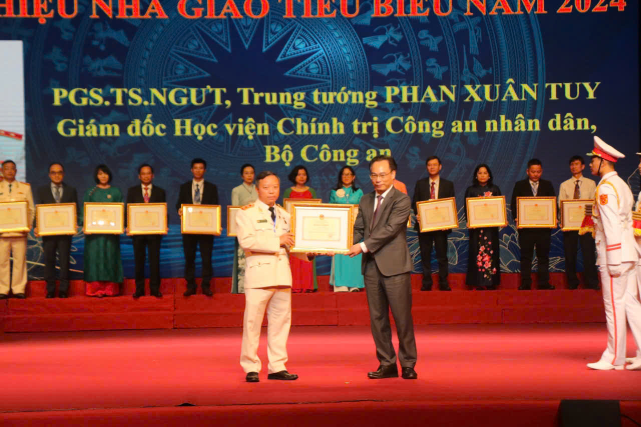 Tại buổi lễ, thừa ủy quyền của Chủ tịch nước, lãnh đạo Bộ GD&ĐT đã trao tặng danh hiệu Nhà giáo Nhân dân cho 21 nhà giáo thuộc các bộ, ngành, địa phương và trao tặng danh hiệu Nhà giáo Ưu tú cho 65 nhà giáo trực thuộc Bộ GD&ĐT và 251 Nhà giáo tiêu biểu năm 2024, trong đó Trung tướng, PGS.TS,NGƯT Phan Xuân Tuy, Giám đốc Học viện Chính trị CAND là một trong 7 nhà giáo trong lực lượng CAND vinh dự được nhận bằng khen Nhà giáo tiêu biểu năm 2024. Tại chương trình, Đoàn Học viện Chính trị CAND do đồng chí Đại tá, TS Tống Văn Khuông, Phó Giám đốc Học viện cùng các đơn vị chức năng thuộc Học viện đã tặng hoa, chúc mừng các Nhà giáo tiêu biểu năm 2024 của lực lượng CAND