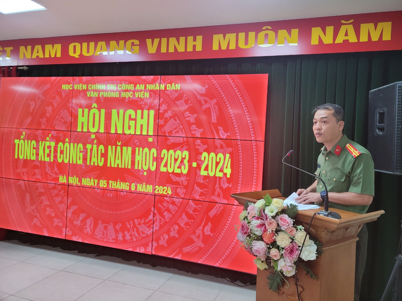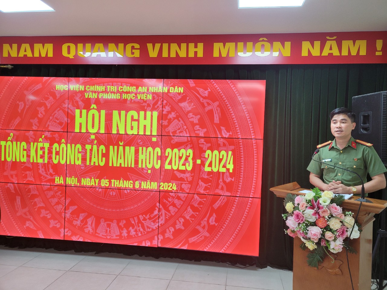 Sáng ngày 05/6/2024, Văn phòng Học viện tổ chức Hội nghị tổng kết công tác năm học 2023 - 2024 và phương hướng, nhiệm vụ công tác năm học 2024 - 2025. Đồng chí Đại tá, TS Tống Văn Khuông, Ủy viên Ban Thường vụ Đảng ủy, Phó Giám đốc Học viện dự và chỉ đạo Hội nghị; đồng chí Trung tá, TS Hoàng Huy Thành, Ủy viên Ban chấp hành Đảng bộ, Bí thư Chi bộ, Chánh Văn phòng Học viện chủ trì Hội nghị. Tham dự Hội nghị có toàn thể lãnh đạo, cán bộ, chiến sĩ, nhân viên Văn phòng Học viện.