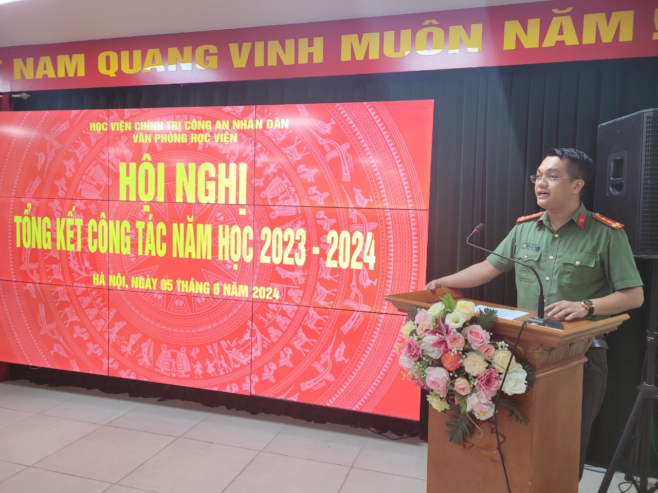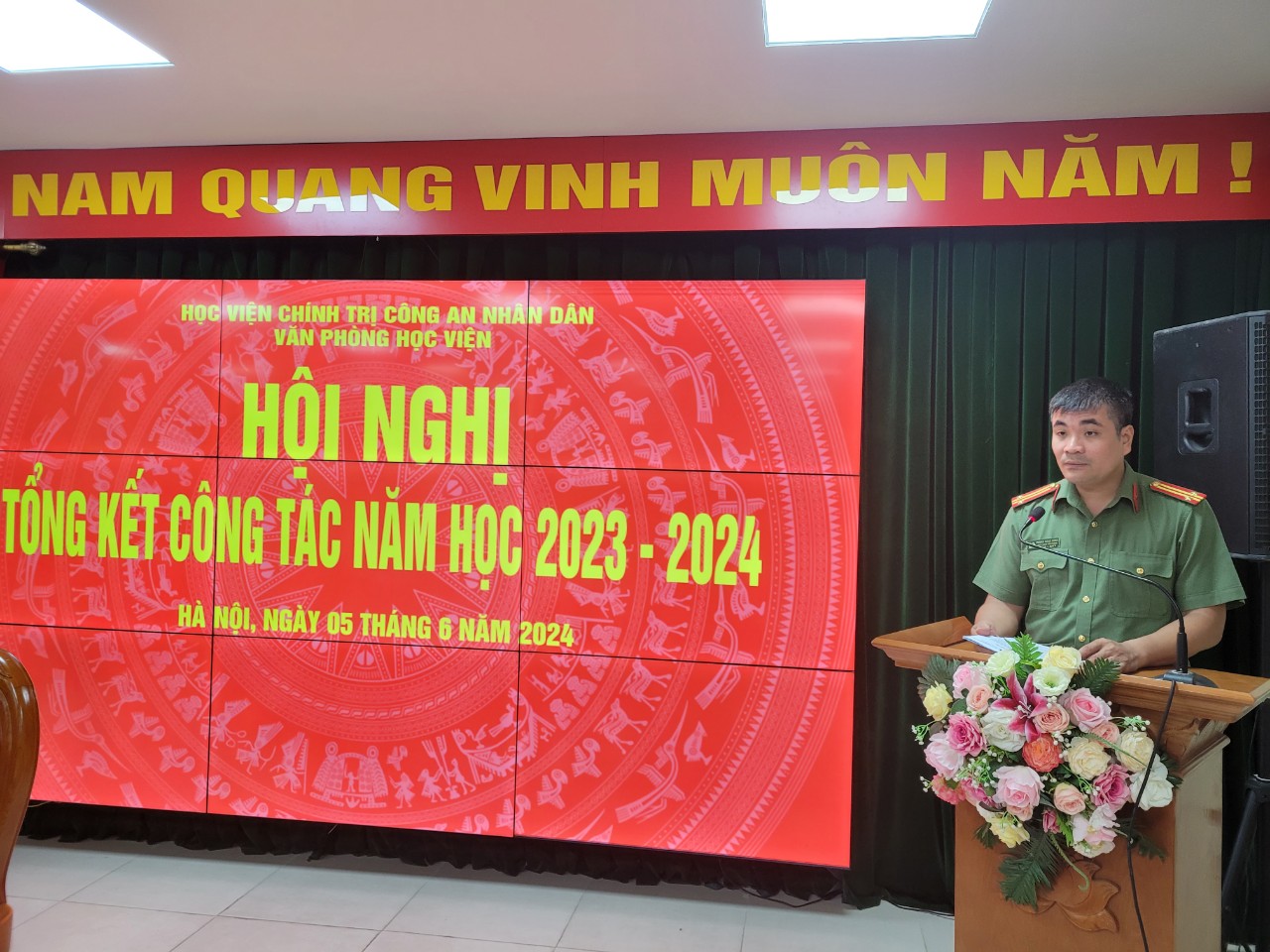 Hội nghị đã nghe dự thảo báo cáo tổng kết công tác năm học 2023 - 2024 và phương hướng, nhiệm vụ công tác năm học 2024 - 2025 của Văn phòng Học viện. Trong năm học vừa qua, đơn vị đã đạt được nhiều kết quả quan trọng, cụ thể: (1) Hoàn thành xuất sắc công tác chuyên môn được giao với nhiều đổi mới, nâng cao chất lượng, hiệu quả; giúp Ban Giám đốc Học viện điều phối, tổ chức tốt các mặt công tác của Học viện; đặc biệt, trong năm học đã tham mưu tổ chức thực hiện các nhiệm vụ công tác lớn, những nhiệm vụ công tác đột xuất được giao; tiếp tục triển khai các nhiệm vụ tham mưu xây dựng Đề án thành lập Học viện Chính trị Công an Lào và giúp đỡ Bạn trong quá trình vận hành, tổ chức đào tạo; chủ trì tham mưu Ban Giám đốc Học viện tổ chức 02 hội thảo khoa học cấp Bộ, 02 hội thảo khoa học cấp Tiểu ban; tiếp nhận, tổ chức triển khai nhiệm vụ Văn phòng Đảng ủy Học viện, tổ chức và triển khai xây dựng Quy chế làm việc, chương trình công tác, phân công nhiệm vụ các đồng chí trong Đảng ủy Học viện; tham mưu triển khai đầu tư xây dựng hạ tầng công nghệ thông tin; (2) Công tác pháp chế, đối ngoại, hợp tác quốc tế được mở rộng, tham mưu Ban Giám đốc tổ chức Hội nghị sơ kết 05 năm thực hiện Quy chế phối hợp giữa Học viện với Cục C10; tổ chức ký quy chế với 02 đơn vị theo kế hoạch.