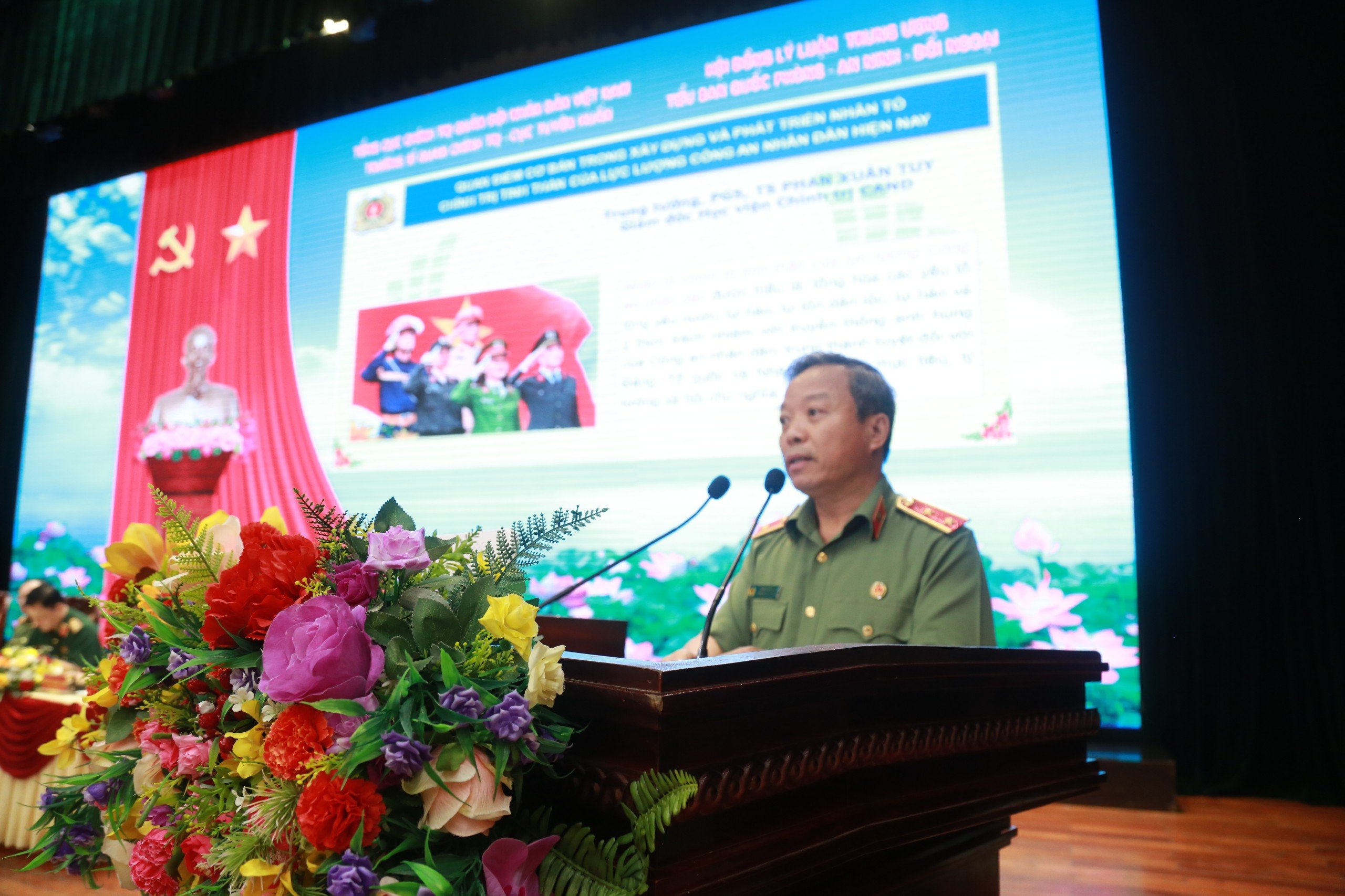 Tại hội thảo, sau phát biểu của các đồng chí Thượng tướng, PGS.TS Nguyễn Văn Thành, Phó Chủ tịch Chuyên trách Hội đồng Lý luận Trung ương, Trưởng Tiểu ban Quốc phòng - An ninh - Đối ngoại; Trung tướng Nguyễn Quốc Tuấn, Chính ủy Trường Sĩ quan chính trị; PGS.TS Lê Hải Bình, Ủy viên Dự khuyết Trung ương Đảng, Tổng Biên tập Tạp chí Cộng sản; Đại tướng Phạm Văn Trà, nguyên Ủy viên Bộ Chính trị, nguyên Bộ Trưởng Bộ Quốc phòng…, đồng chí Trung tướng, PGS.TS Phan Xuân Tuy, Bí thư Đảng ủy, Giám đốc Học viện Chính trị CAND phát biểu tham luận với chủ đề: “Quan điểm cơ bản trong xây dựng và phát triển nhân tố chính trị tinh thần của lực lượng Công an nhân dân hiện nay”.