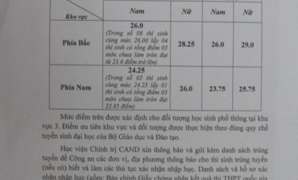Hội đồng tuyển sinh Học viện Chính trị CAND thông báo điểm trúng tuyển vào nhóm ngành Chính trị CAND, Khóa D4 - Năm học 2017 như sau: