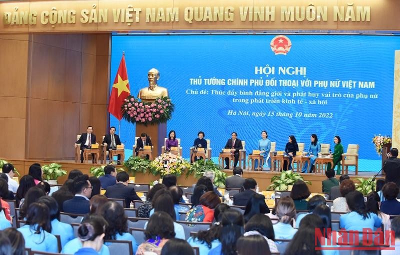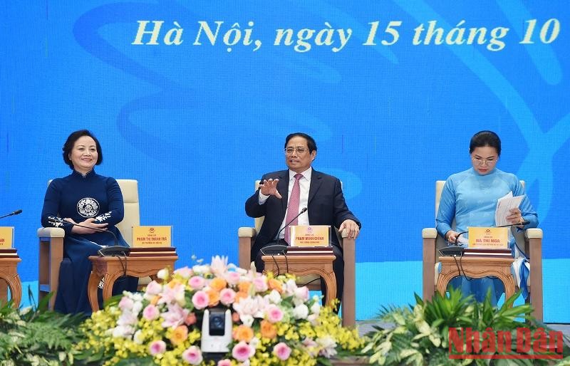 Thủ tướng Phạm Minh Chính và các đại biểu tham dự Hội nghị đối thoại với phụ nữ Việt Nam sáng 15/10.