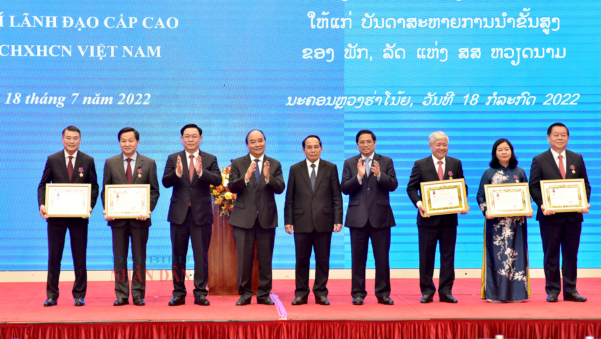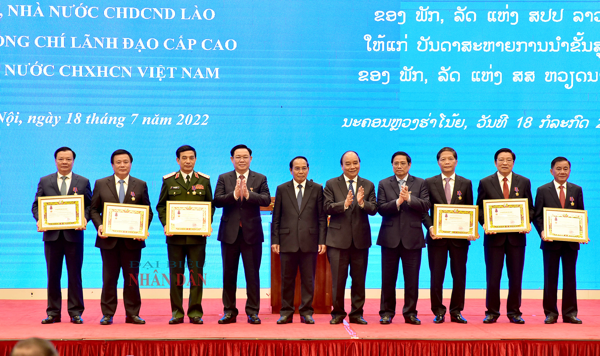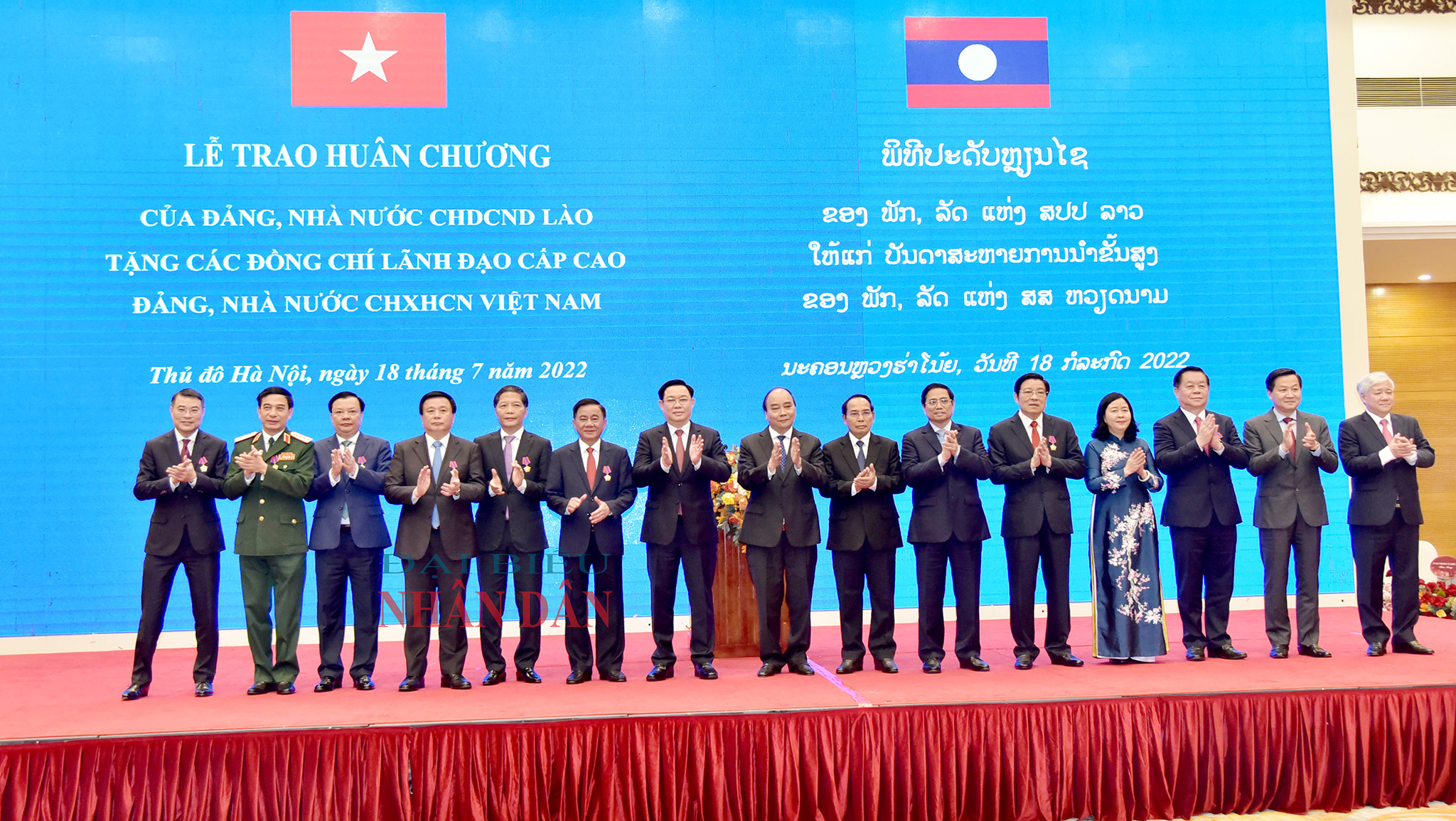 Chiều 18/7, Lễ trao tặng Huân chương của Đảng và Nhà nước Cộng hoà Dân chủ Nhân dân Lào tặng các đồng chí Lãnh đạo cấp cao Đảng và Nhà nước Cộng hoà Xã hội Chủ nghĩa Việt Nam đã được tổ chức trọng thể tại Thủ đô Hà Nội.