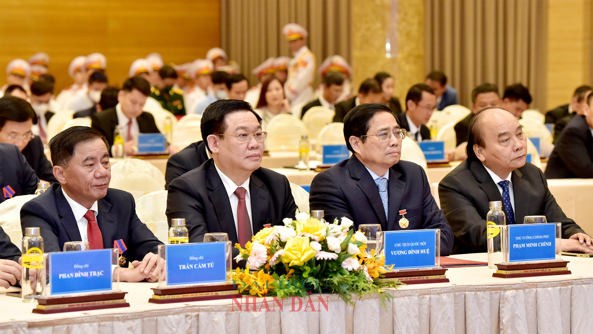 Ủy viên Bộ Chính trị, Chủ tịch Nước Nguyễn Xuân Phúc; Ủy viên Bộ Chính trị, Thủ tướng Chính phủ Phạm Minh Chính; Ủy viên Bộ Chính trị, Chủ tịch Quốc hội Vương Đình Huệ và các đại biểu tại buổi lễ. Ảnh: Lâm Hiển