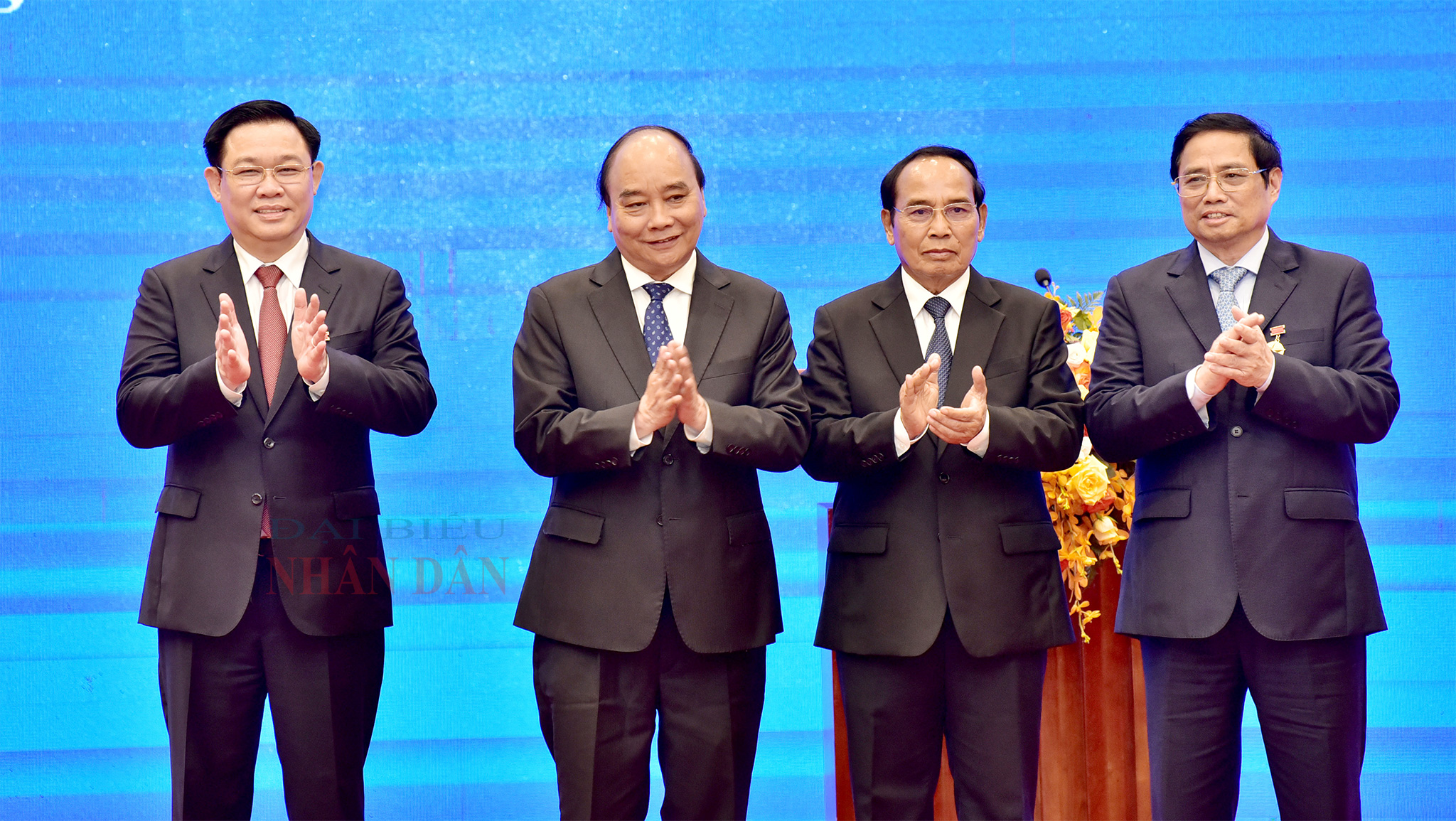 Chủ tịch Nước Nguyễn Xuân Phúc, Thủ tướng Chính phủ Phạm Minh Chính, Chủ tịch Quốc hội Vương Đình Huệ, Ủy viên Bộ Chính trị, Thường trực Ban Bí thư Trung ương Đảng Nhân dân cách mạng Lào, Phó Chủ tịch nước Cộng hòa dân chủ Nhân dân Lào Bounthong Chitmany, cùng các đồng chí lãnh đạo Đảng, Nhà nước tại buổi lễ. Ảnh: Lâm Hiển