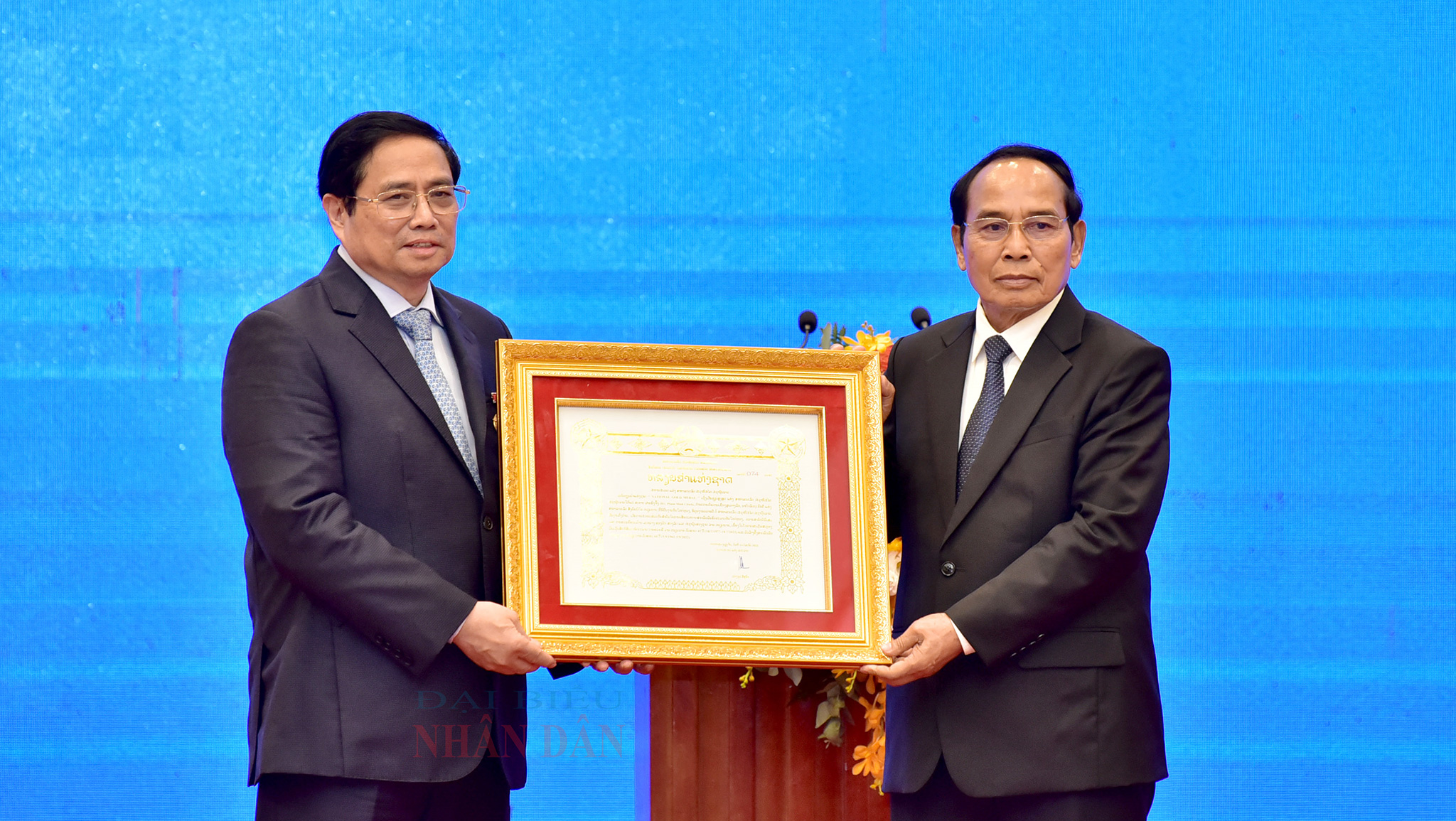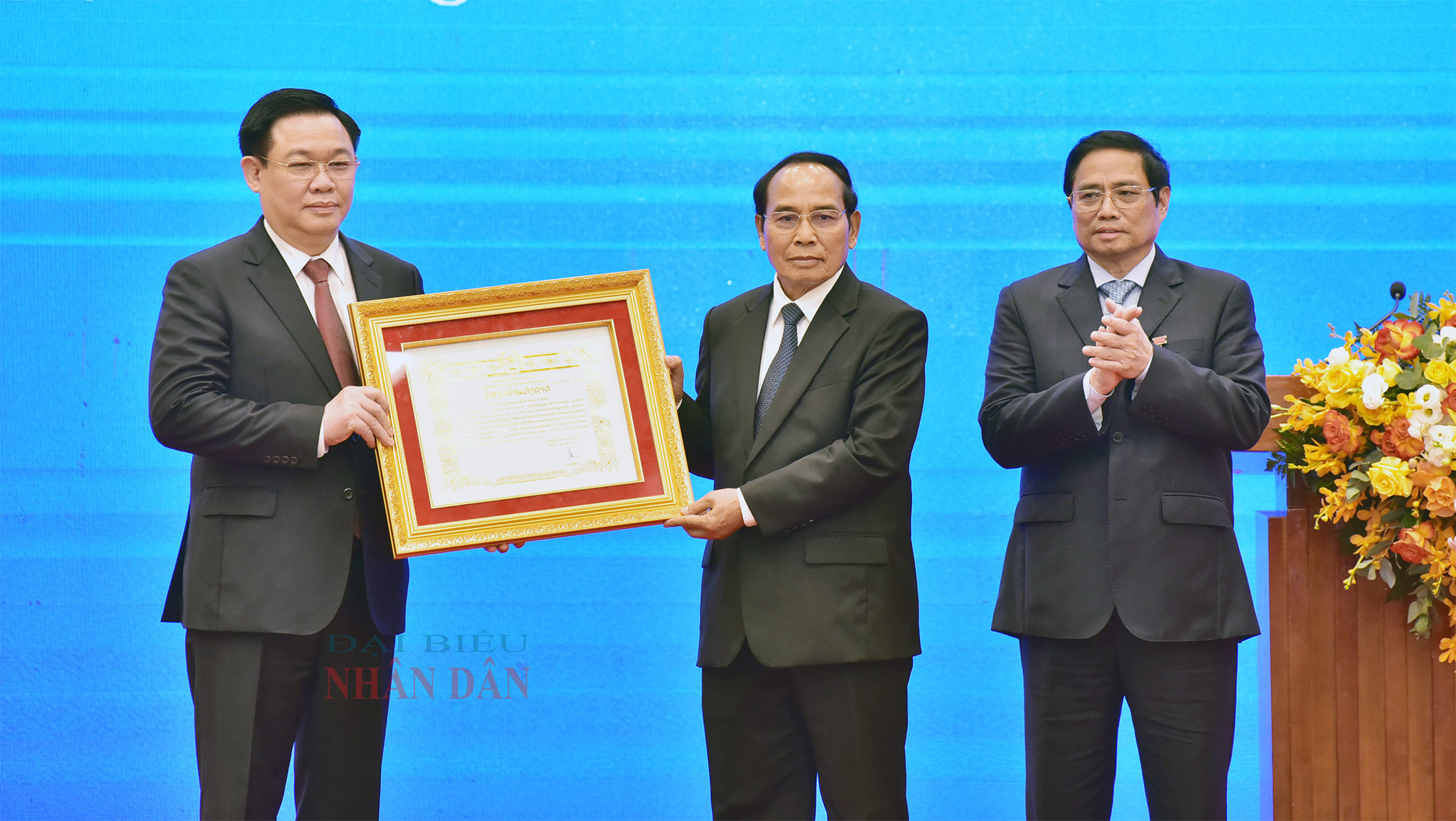 Tại buổi lễ, được sự ủy quyền của Lãnh đạo Đảng và Nhà nước Lào, Ủy viên Bộ Chính trị, Thường trực Ban Bí thư Trung ương Đảng Nhân dân cách mạng Lào, Phó Chủ tịch Nước Lào Bounthong Chitmany đã trao tặng Thủ tướng Chính phủ Phạm Minh Chính và Chủ tịch Quốc hội Vương Đình Huệ Huân chương Vàng quốc gia. Đây là Huân chương cao quý nhất của Đảng, Nhà nước Lào nhằm ghi nhận công lao, sự đóng góp to lớn của Thủ tướng Chính phủ Phạm Minh Chính và Chủ tịch Quốc hội Vương Đình Huệ đối với việc củng cố, vun đắp mối quan hệ hữu nghị vĩ đại, tình đoàn kết đặc biệt và hợp tác toàn diện giữa hai Đảng, hai Nhà nước và nhân dân hai nước trong suốt thời gian qua.