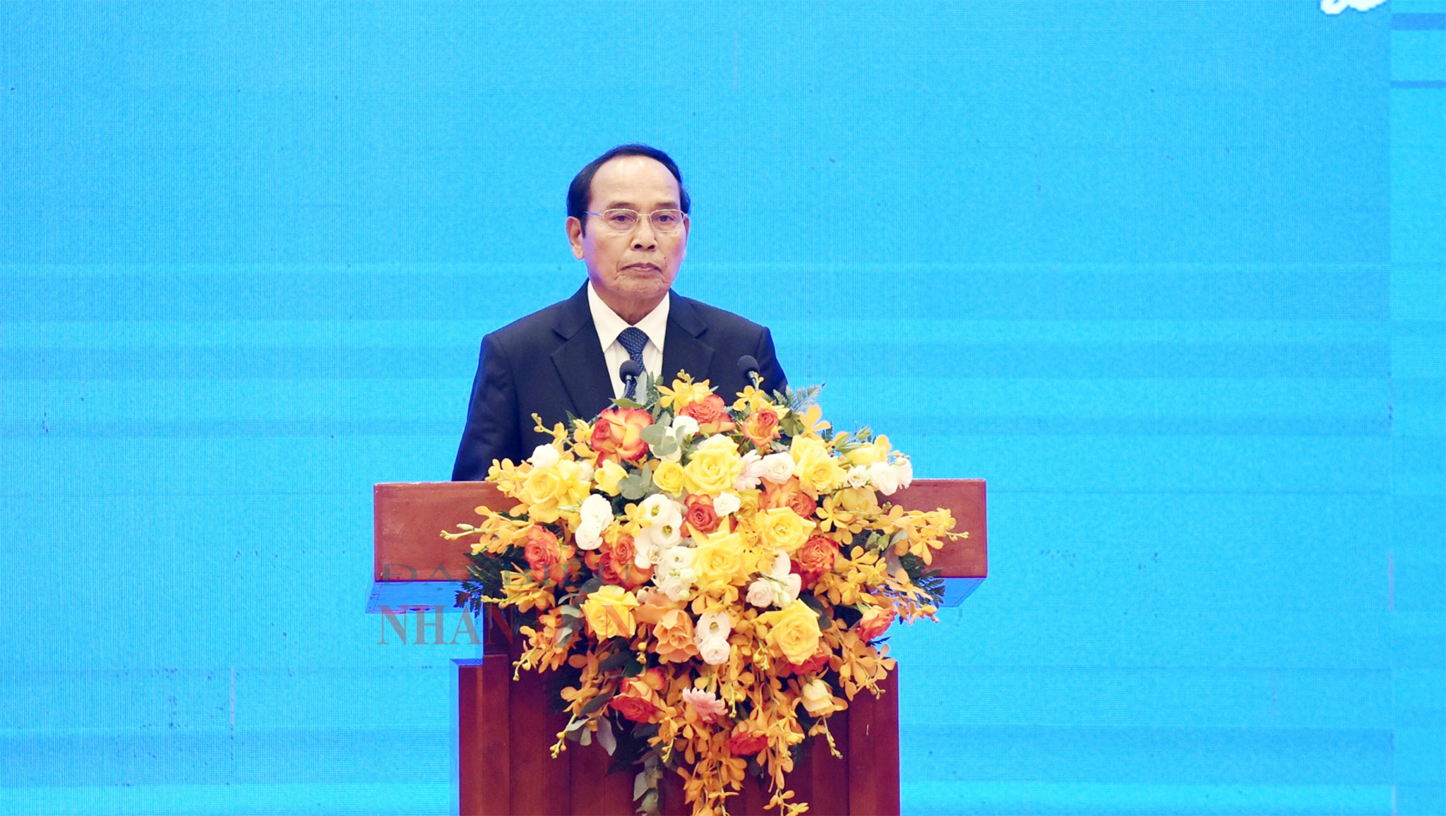 Ủy viên Bộ Chính trị, Thường trực Ban Bí thư Trung ương Đảng Nhân dân cách mạng Lào, Phó Chủ tịch nước Cộng hòa dân chủ Nhân dân Lào Bounthong Chitmany phát biểu tại buổi lễ. Ảnh: Lâm Hiển