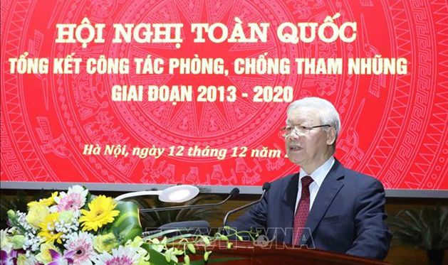 Tổng Bí thư, Chủ tịch nước Nguyễn Phú Trọng, Trưởng Ban Chỉ đạo Trung ương về phòng, chống tham nhũng phát biểu tại Hội nghị trực tuyến toàn quốc, tổng kết công tác phòng, chống tham nhũng giai đoạn 2013-2020. (Ảnh: TTXVN)