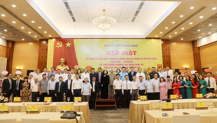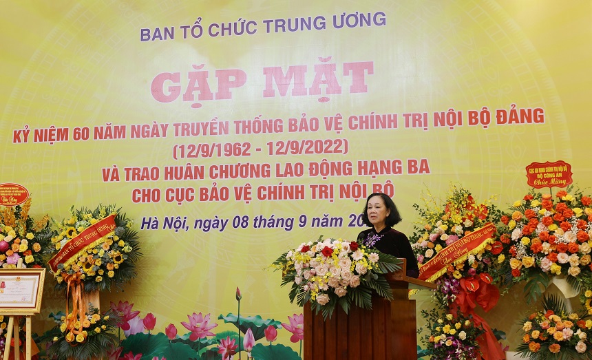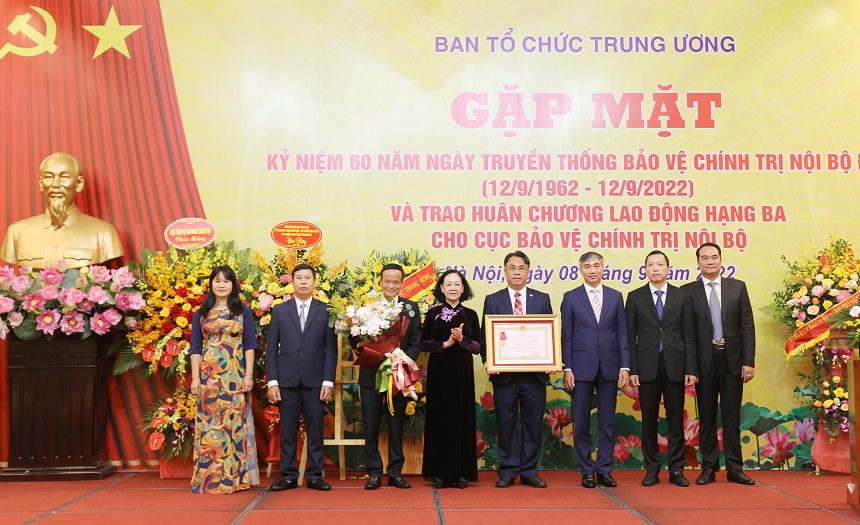 Chiều 8-9, Ban Tổ chức Trung ương tổ chức gặp mặt kỷ niệm 60 năm Ngày truyền thống Bảo vệ chính trị nội bộ Đảng (12-9-1962 - 12-9-2022) và trao Huân chương Lao động hạng Ba cho Cục Bảo vệ chính trị nội bộ. Đồng chí Trương Thị Mai, Ủy viên Bộ Chính trị, Bí thư Trung ương Đảng, Trưởng Ban Tổ chức Trung ương, Trưởng Tiểu ban Bảo vệ chính trị nội bộ Trung ương chủ trì buổi gặp.