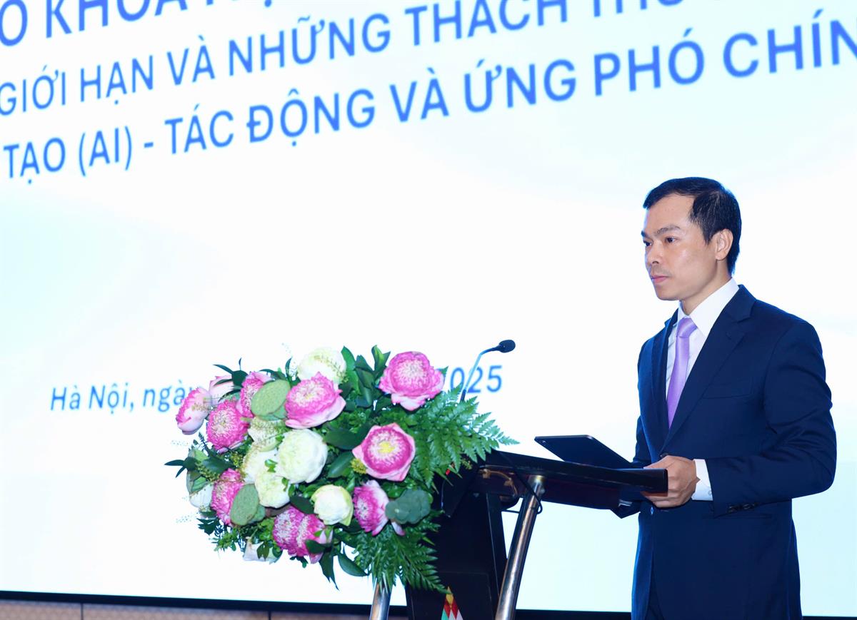 Phát biểu đề dẫn hội thảo, GS,TS Nguyễn Xuân Thắng, Uỷ viên Bộ Chính trị, Giám đốc Học viện Chính trị quốc gia Hồ Chí Minh, Chủ tịch Hội đồng Lý luận Trung ương nhấn mạnh, Hội thảo là dịp quan trọng để lãnh đạo các cơ quan nhà nước, các nhà khoa học, các chuyên gia và doanh nghiệp cùng nhau phân tích những tác động to lớn, những cơ hội chưa từng có và những rủi ro tiềm ẩn khó dự báo khi ứng dụng AI; từ đó xác định ứng phó chính sách phù hợp, kịp thời để Việt Nam có thể làm chủ công nghệ AI, xây dựng mô hình AI Việt Nam bằng ngôn ngữ lớn tiếng Việt, hướng tới việc xây dựng một môi trường phát triển AI bền vững, vì lợi ích quốc gia, cộng đồng và xã hội.