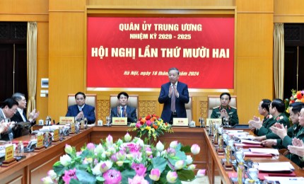 Hội nghị Quân uỷ Trung ương lần thứ 12 dưới sự chủ trì của Tổng Bí thư Tô Lâm, Bí thư Quân uỷ Trung ương. Ảnh: Thống Nhất/TTXVN