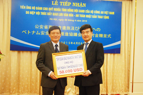 Trung tướng Trần Văn Nhuận, Phó Tổng cục trưởng Tổng cục Chính trị CAND, Giám đốc Quỹ “Nghĩa tình đồng đội CAND” tiếp nhận 50.000 USD của phía Nhật Bản trao tặng.