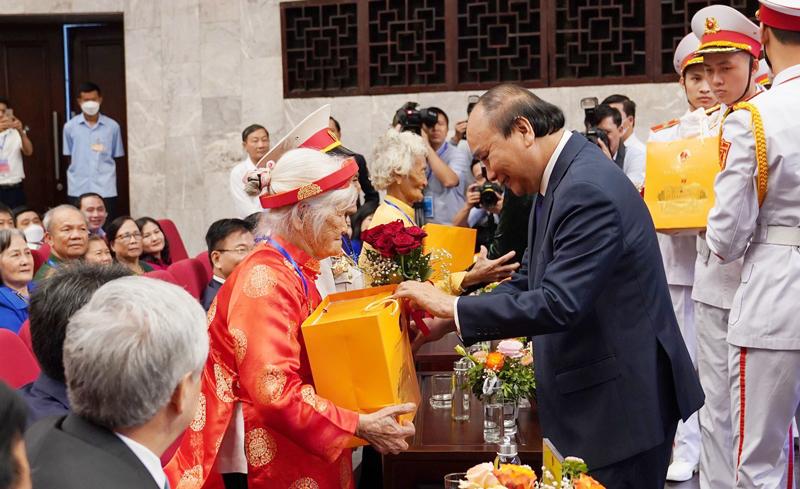 Chủ tịch nước Nguyễn Xuân Phúc trao quà tặng người có công với cách mạng.