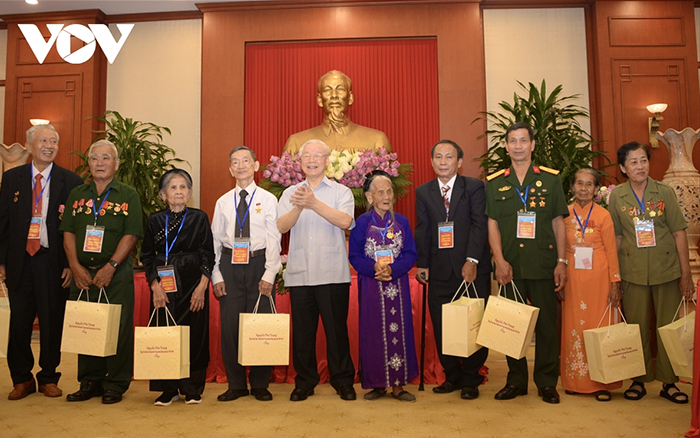 Nói chuyện thân mật với các đại biểu Người có công tiêu biểu trong cả nước, Tổng Bí thư Nguyễn Phú Trọng bày tỏ lòng thành kính tưởng nhớ đến các bậc anh hùng liệt sĩ đã hy sinh vì Tổ quốc; trân trọng gửi tới các bác, các đồng chí lão thành cách mạng, các Mẹ Việt Nam anh hùng, anh hùng lực lượng vũ trang, các đồng chí thương binh, bệnh binh, thân nhân gia đình liệt sĩ và người có công với cách mạng lời chào thân ái, lời thăm hỏi chân tình, những tình cảm sâu nặng và lòng biết ơn sâu sắc nhất.