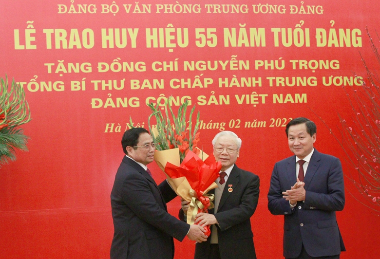 (ĐCSVN) - Trong không khí toàn Đảng, toàn dân và toàn quân ta đang thi đua sôi nổi chào mừng 93 năm Ngày thành lập Đảng Cộng sản Việt Nam (3/2/1930-3/2/2023), chiều 2/2, tại Trụ sở Trung ương Đảng, Đảng ủy Văn phòng Trung ương Đảng đã tổ chức Lễ trao Huy hiệu 55 năm tuổi Đảng tặng đồng chí Nguyễn Phú Trọng, Tổng Bí thư Ban Chấp hành Trung ương Đảng Cộng sản Việt Nam.