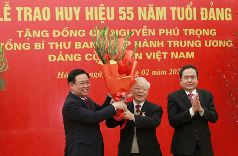 Thay mặt lãnh đạo Đảng, đồng chí Võ Văn Thưởng, Thường trực Ban Bí thư đã trân trọng trao Huy hiệu 55 năm tuổi Đảng và tặng hoa chúc mừng đồng chí Nguyễn Phú Trọng, Tổng Bí thư Ban Chấp hành Trung ương Đảng Cộng sản Việt Nam.