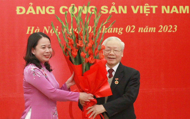 | Quyền Chủ tịch nước Võ Thị Ánh Xuân tặng hoa chúc mừng Tổng Bí thư Nguyễn Phú Trọng. Ảnh: Phạm Cường |