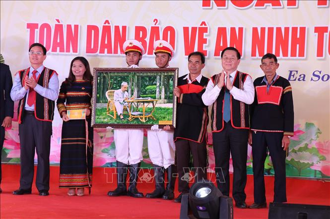 Bí thư Trung ương Đảng, Trưởng Ban Tuyên giáo Trung ương Nguyễn Trọng Nghĩa tặng quà lưu niệm cho xã Ea Sol, huyện Ea H’leo trong Ngày hội toàn dân bảo vệ an ninh Tổ quốc.