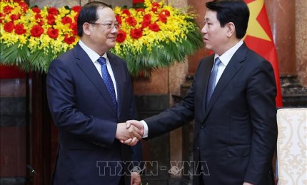 Chủ tịch nước Lương Cường tiếp Thủ tướng Lào Sonexay Siphandone